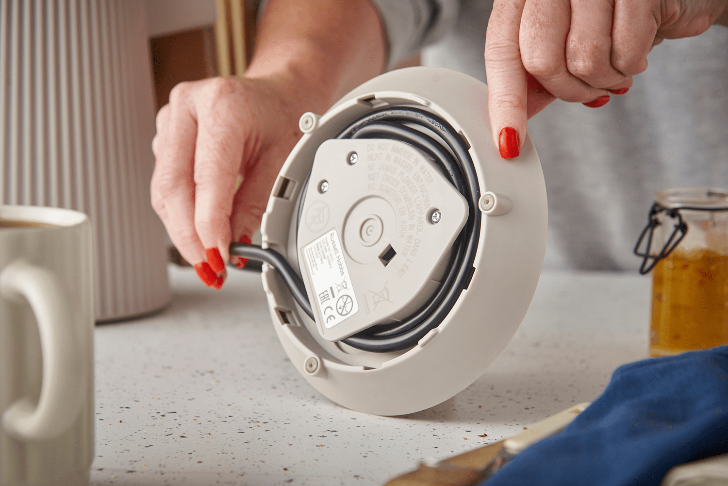 360° pyörivä alusta mahdollistaa käytön kummallakin kädellä. Piilotettu johdon säilytys pitää keittiön siistinä ja järjestyksessä.