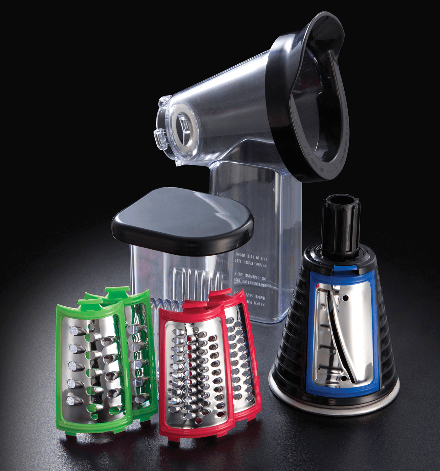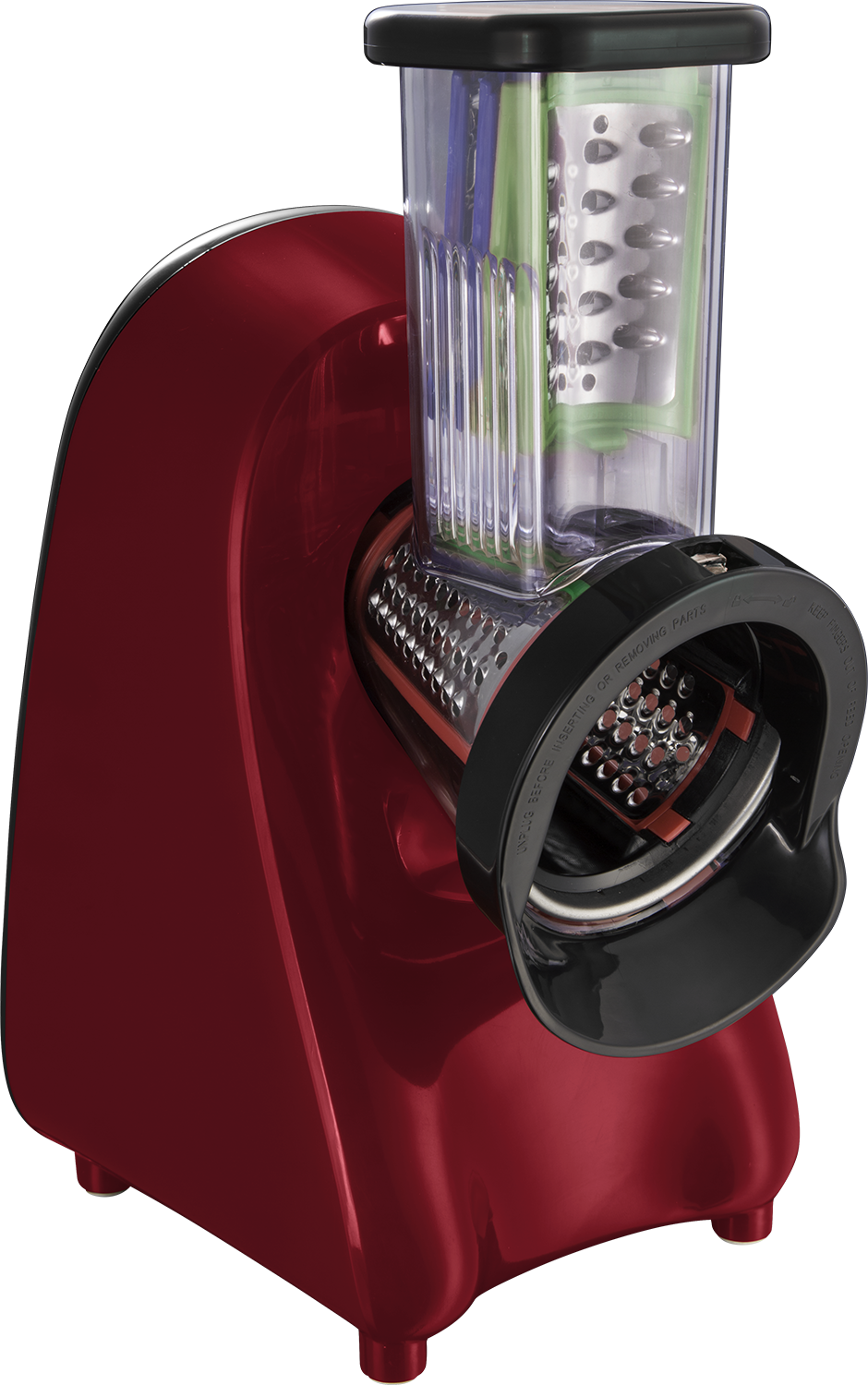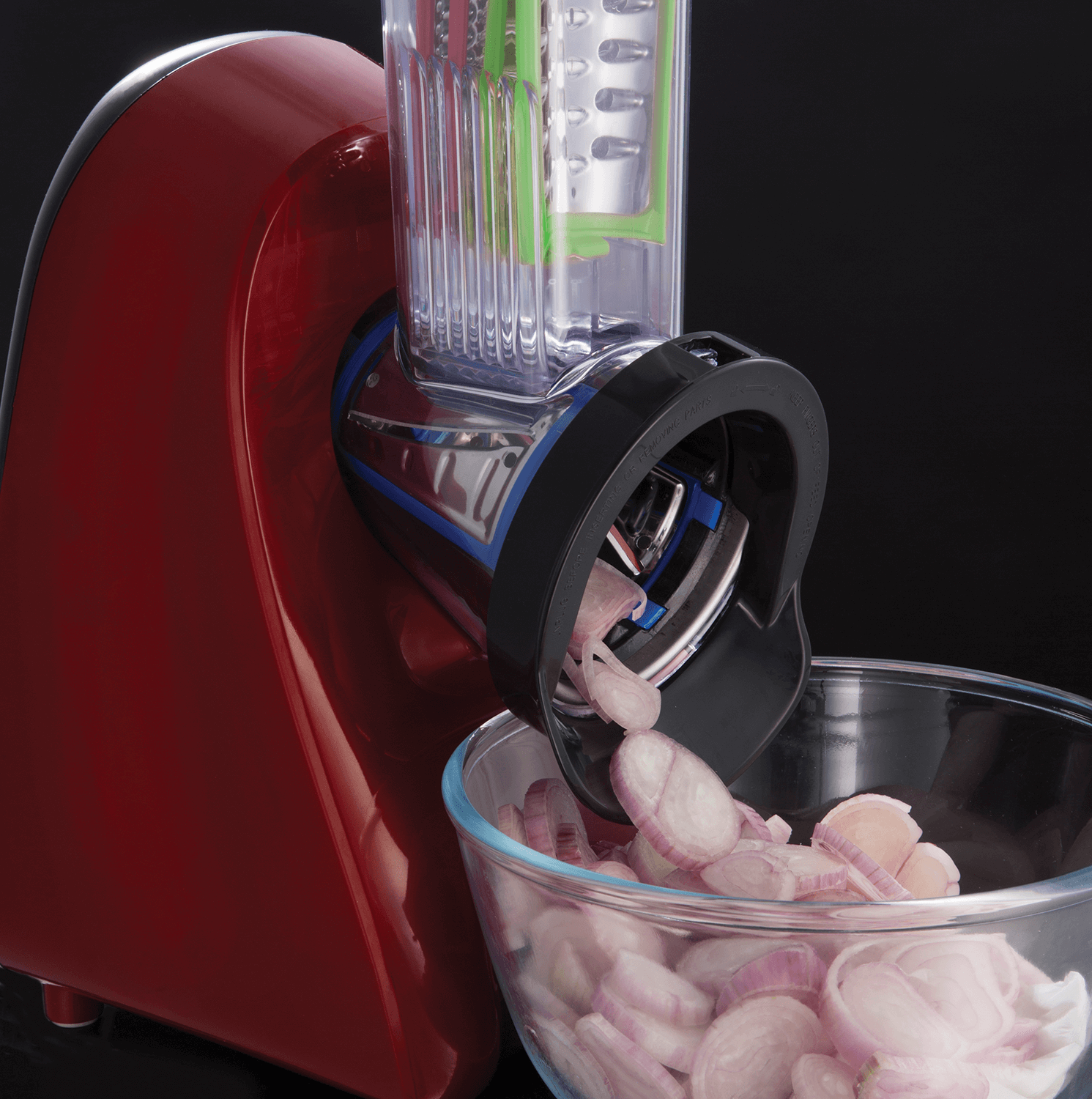 Täydellinen muotoilu ja toiminta yhdistyvät tässä raastimessa, jonka ritilä, silppuri ja viipalointityökalu on valmistettu kestävästä ruostumattomasta teräksestä. Tyylikäs punainen ja musta väritys tuovat modernia ilmettä keittiöösi.