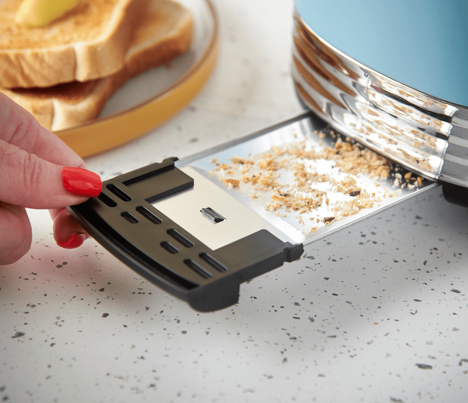 Integroitu murutarjotin kerää murut ja pitää työtason siistinä. Lisäksi ritilällä lämmität croissantit ja sämpylät hellävaraisesti - täydellinen pieni ylellisyys arkeen.