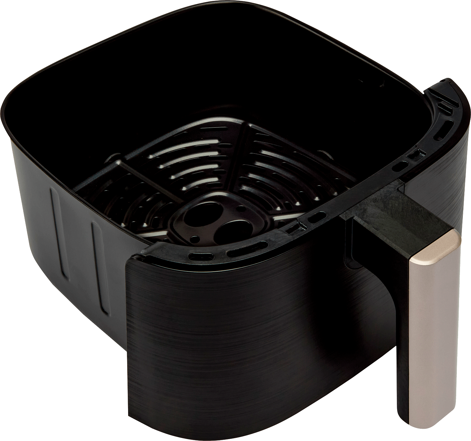 Samppanjansävyiset yksityiskohdat tuovat tyylikästä kontrastia laitteen mustaan runkoon, tehden siitä ehdottoman tyylikkään valinnan keittiöön kuin keittiöön. Keraaminen rapeutuslevy varmistaa, että ylimääräinen öljy valuu pois ja ruoka kypsyy tasaisen rapeaksi ilman, että mehukkuus ja maku kärsivät.