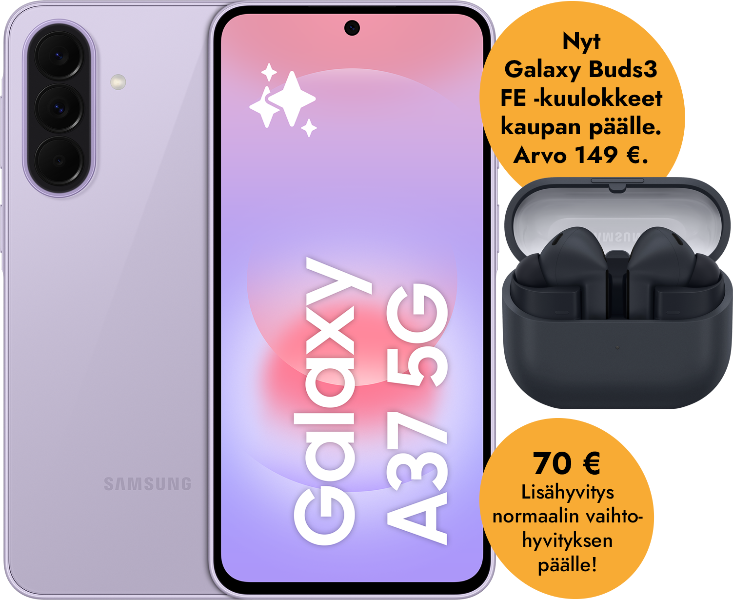 Ostaessasi Galaxy A37 -puhelimen 10-30.4.2026 välisenä kampanja-aikana, saat Galaxy Buds3 FE -kuulokkeet kaupan päälle. Edun arvo 149 euroa.