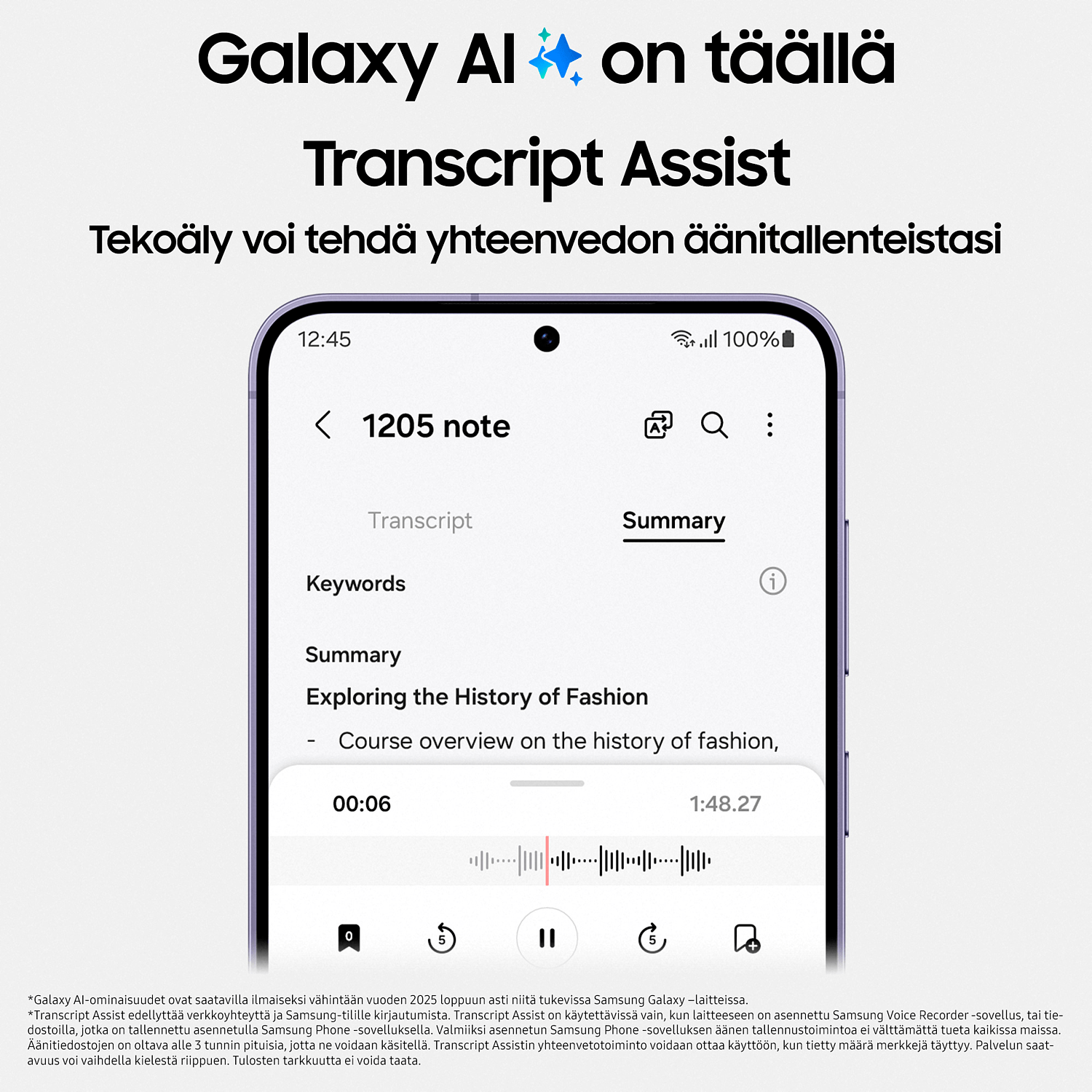 Älypuhelinten uusi aika alkaa nyt. Galaxy AI muuttaa mielikuvat Samsung-älypuhelinten käytöstä ja mullistaa tapamme luoda, kommunikoida ja olla yhteydessä toisiimme. Käsilläsi on älypuhelin, joka ei ainoastaan helpota jokapäiväistä elämääsi, vaan käynnistää uuden aikakauden. Tulevaisuus on täällä tänään.