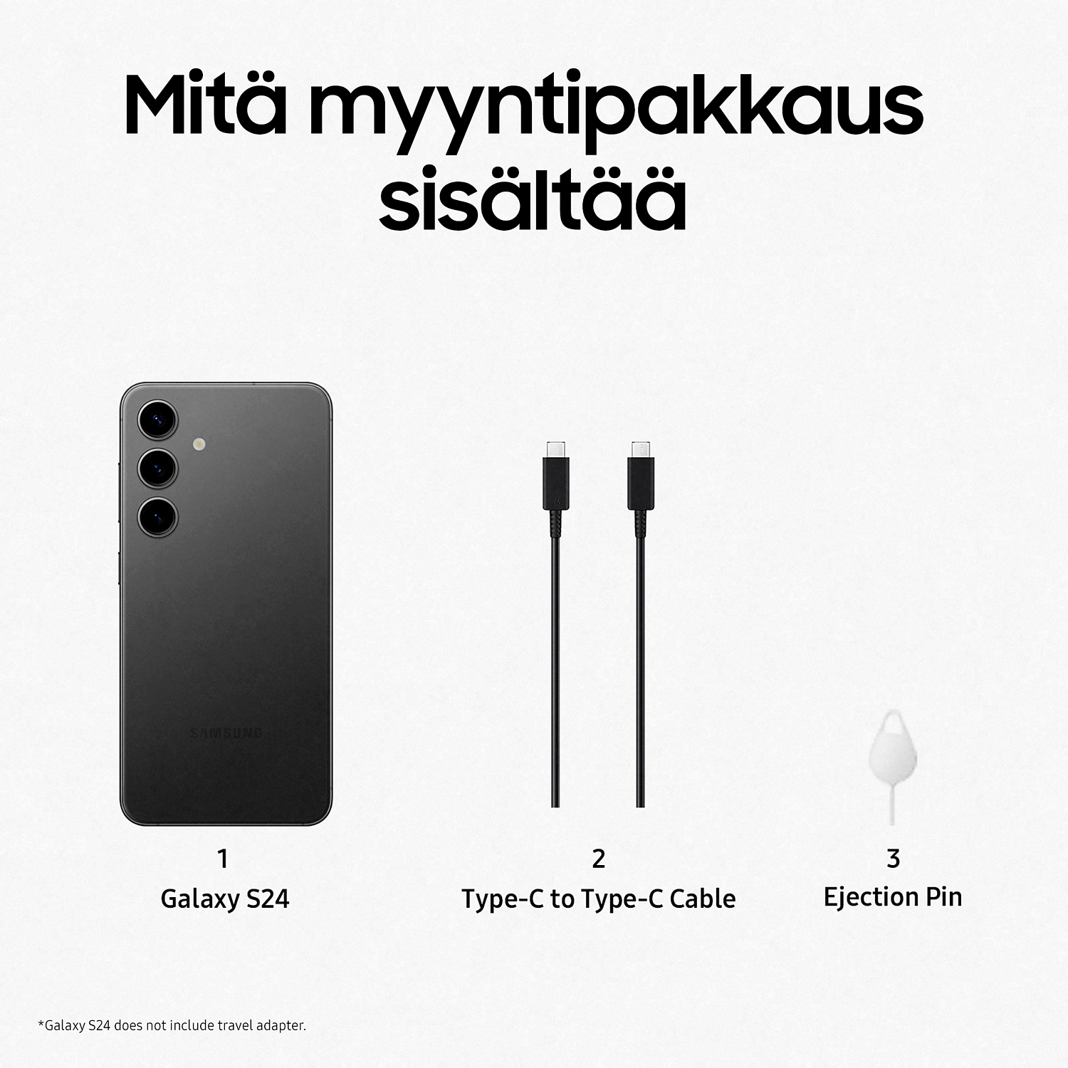 Pakkauksessa mukana Galaxy S24 -puhelin, USB Type-C -kaapeli (25 W lataukseen), SIM-kortin poistotyökalu ja pikaopas.