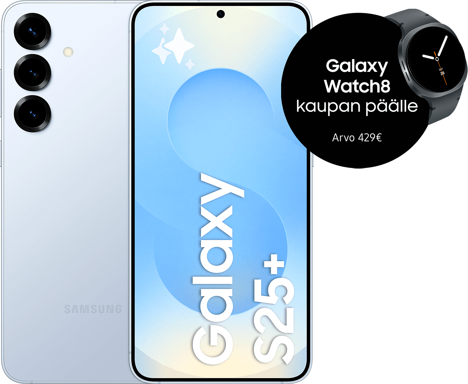 Osta Samsung Galaxy S25+ -puhelin 2.12. - 23.12.2025 välisenä aikana, ja saat kaupan päälle Galaxy Watch8 40mm eSim -älykellon (arvo 429 €)!