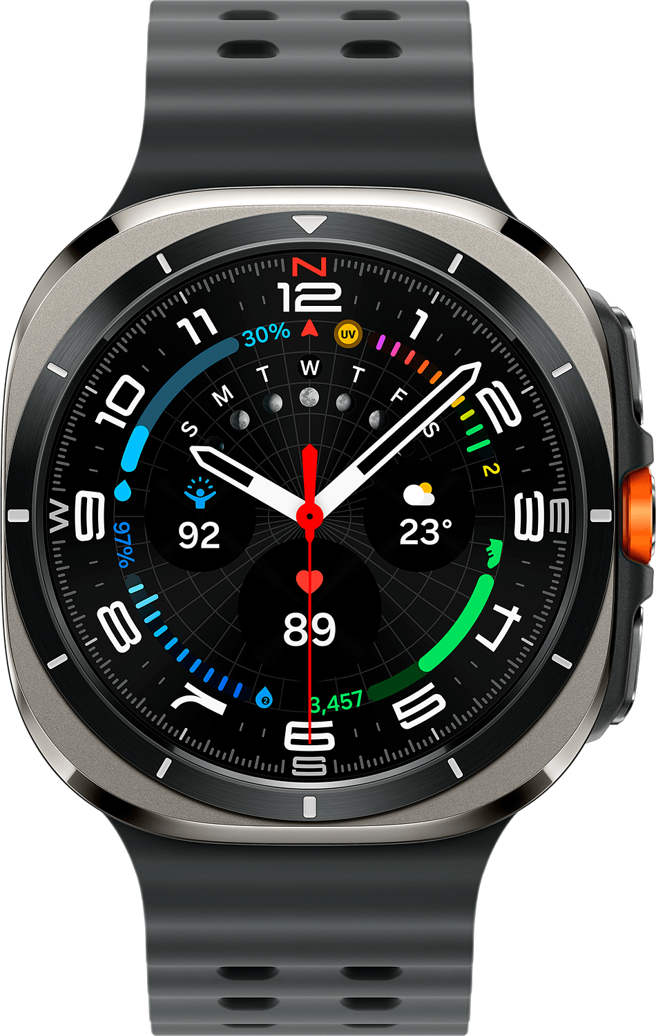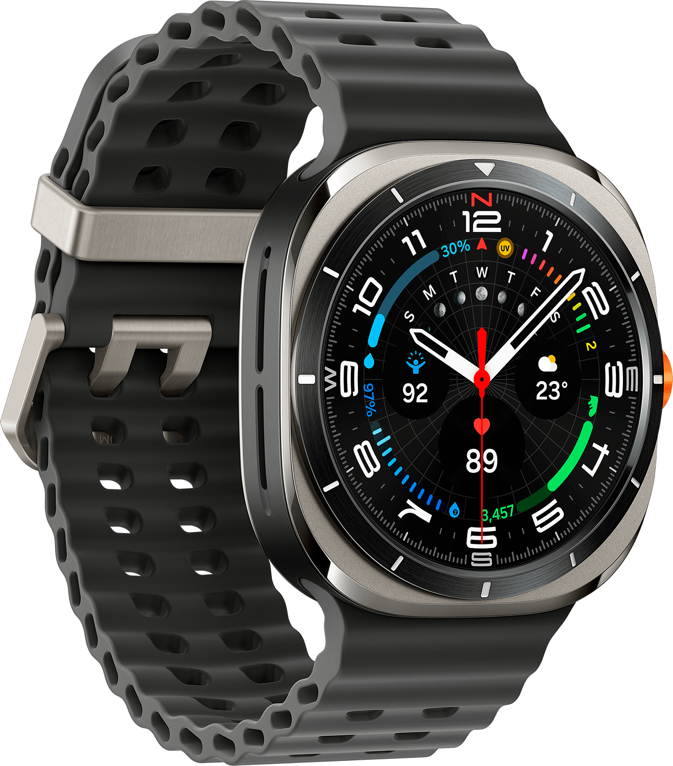 Galaxy Watch Ultra (2025) on suunniteltu vaativiin olosuhteisiin. Lentokonetason titaani, safiirilasi, vesi- ja pölytiiviys sekä kestävä ranneke tekevät Galaxy Watch Ultrasta täydellisen valinnan kovatasoisille urheilijoille. Lukuisten kellotaulujen lisäksi tarjolla on myös runsaasti design-rannekkeita, joista monet ovat varustettu one-click-järjestelmällä, jonka ansiosta vaihdat rannekkeen nopeasti päivääsi sopivaksi. Yhdistele luodaksesi juuri sinulle sopiva kokonaisuus.