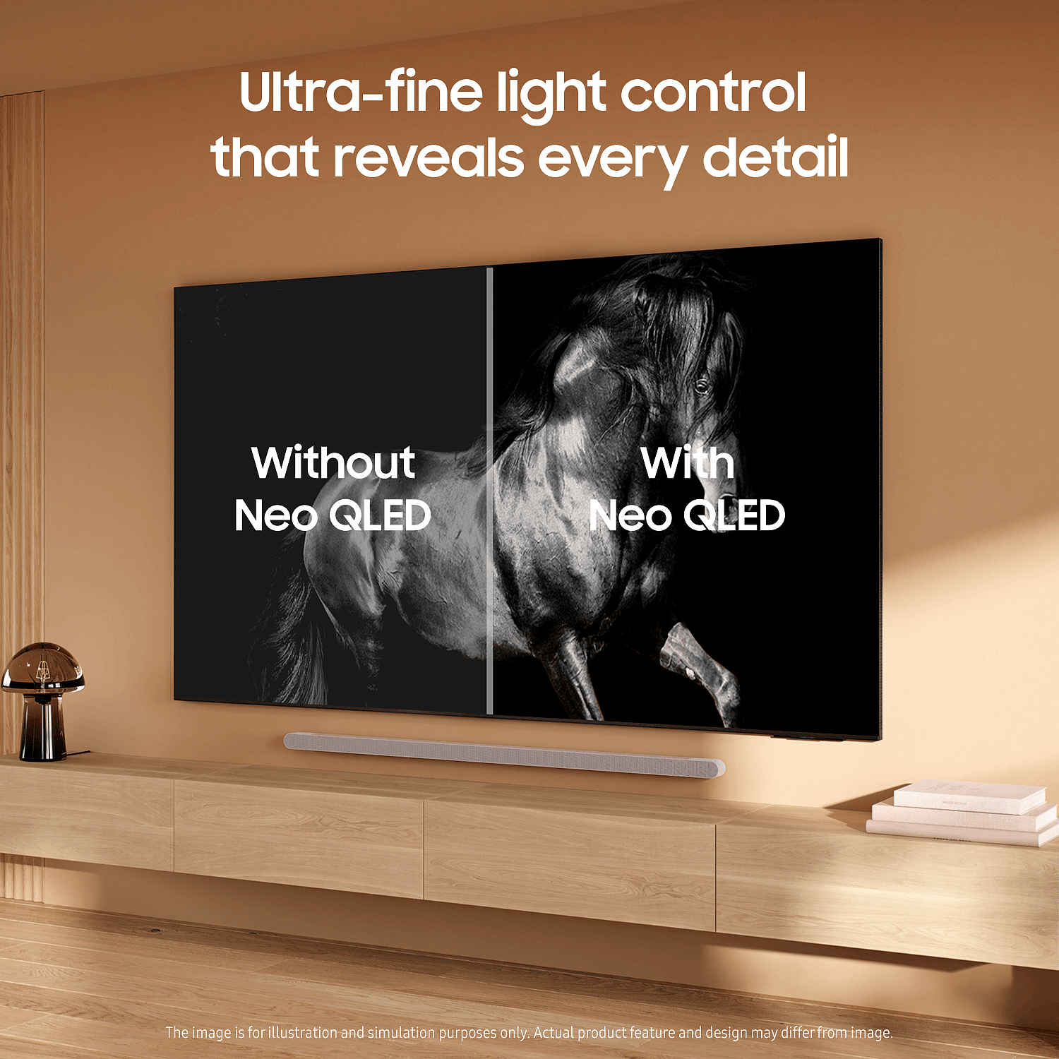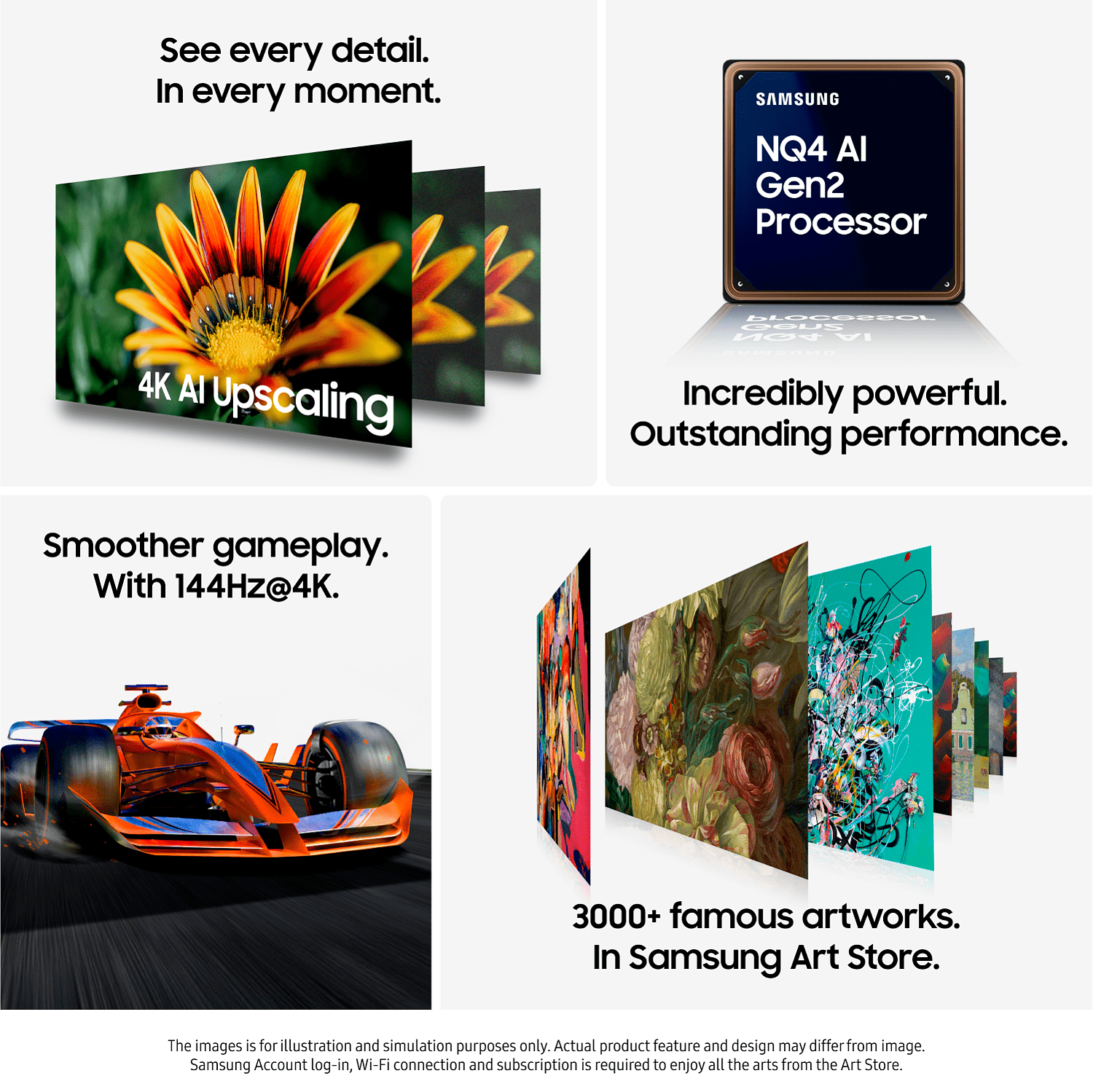Samsungin NQ4 AI Gen2 -prosessori käyttää 20 tekoälyverkkoa skaalaamaan matalatarkkuuksisen sisällön lähes 4K-laadulle. Real Depth Enhancer jäljittelee ihmissilmän tapaa havaita syvyyttä, korostaen etualan kohteita ja luoden kolmiulotteisen vaikutelman. Quantum Matrix Technology Slim ohjaa Mini LED -taustavaloja tarkasti, mikä takaa syvän kontrastin ja kirkkaat yksityiskohdat. Neo Quantum HDR ja Color Booster Pro tuottavat tarkkaa värintoistoa, joka on PANTONE Validated -sertifioitu - 2 140 väriä ja 110 ihonsävyä toistuvat luonnollisesti ja elävästi.