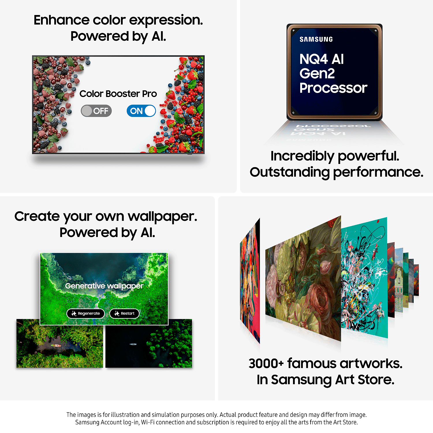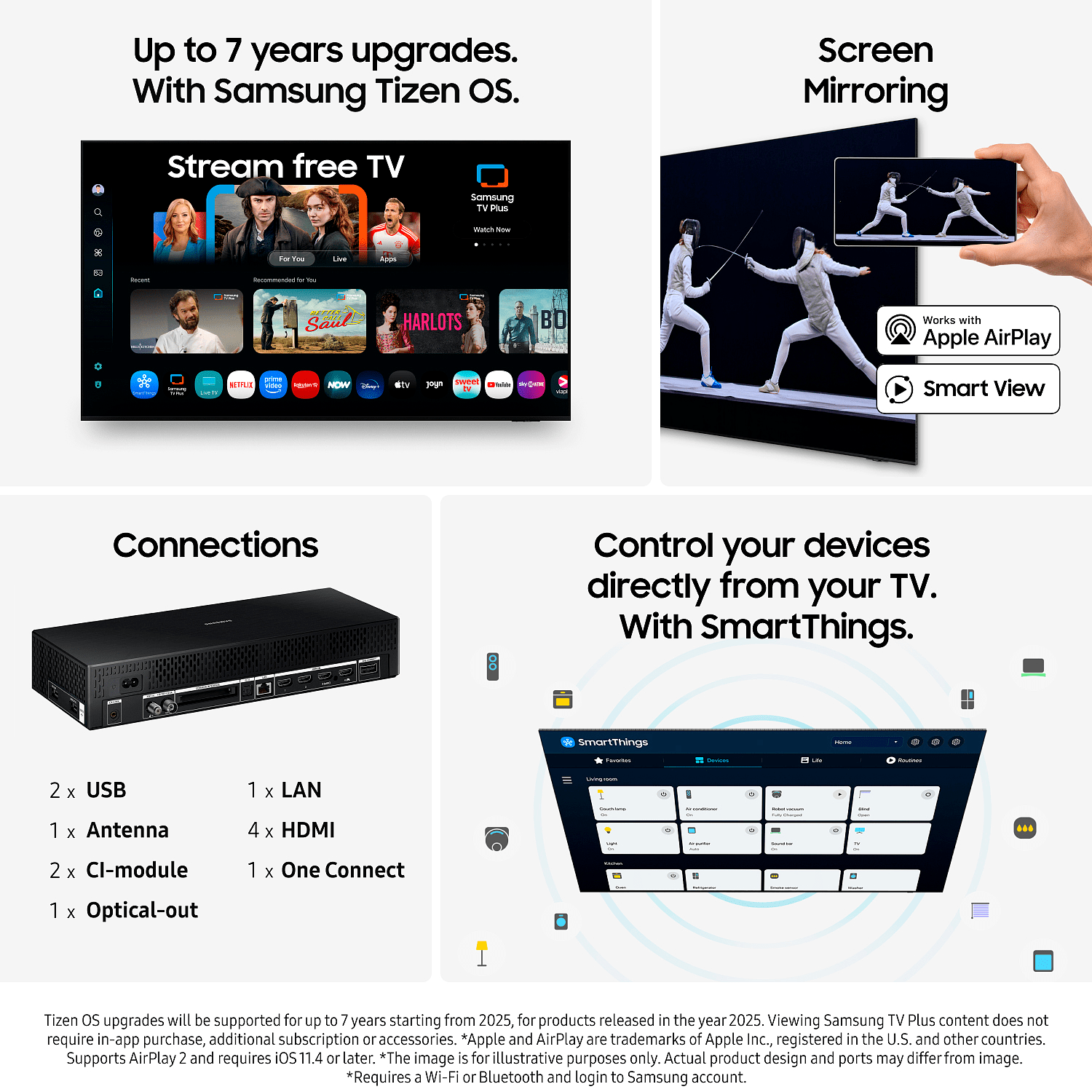 SolarCell-kaukosäädin toimii valolla, joten paristoja ei tarvita. Siinä on myös sisäänrakennettu mikrofoni ja ääniavustaja, jotka tekevät käytöstä entistä helpompaa. Samsung Vision AI tuo uusia älytoimintoja, jotka mukautuvat katselutottumuksiisi. Generative Wallpaper -ominaisuus luo tekoälyn avulla uniikkeja taustakuvia valitsemiesi avainsanojen perusteella - täydellinen tapa muuttaa kodin tunnelmaa. Active Voice Amplifier Pro analysoi ympäristön äänet ja parantaa puheen selkeyttä automaattisesti, jotta kuulet dialogin selkeästi myös taustamelun keskellä.