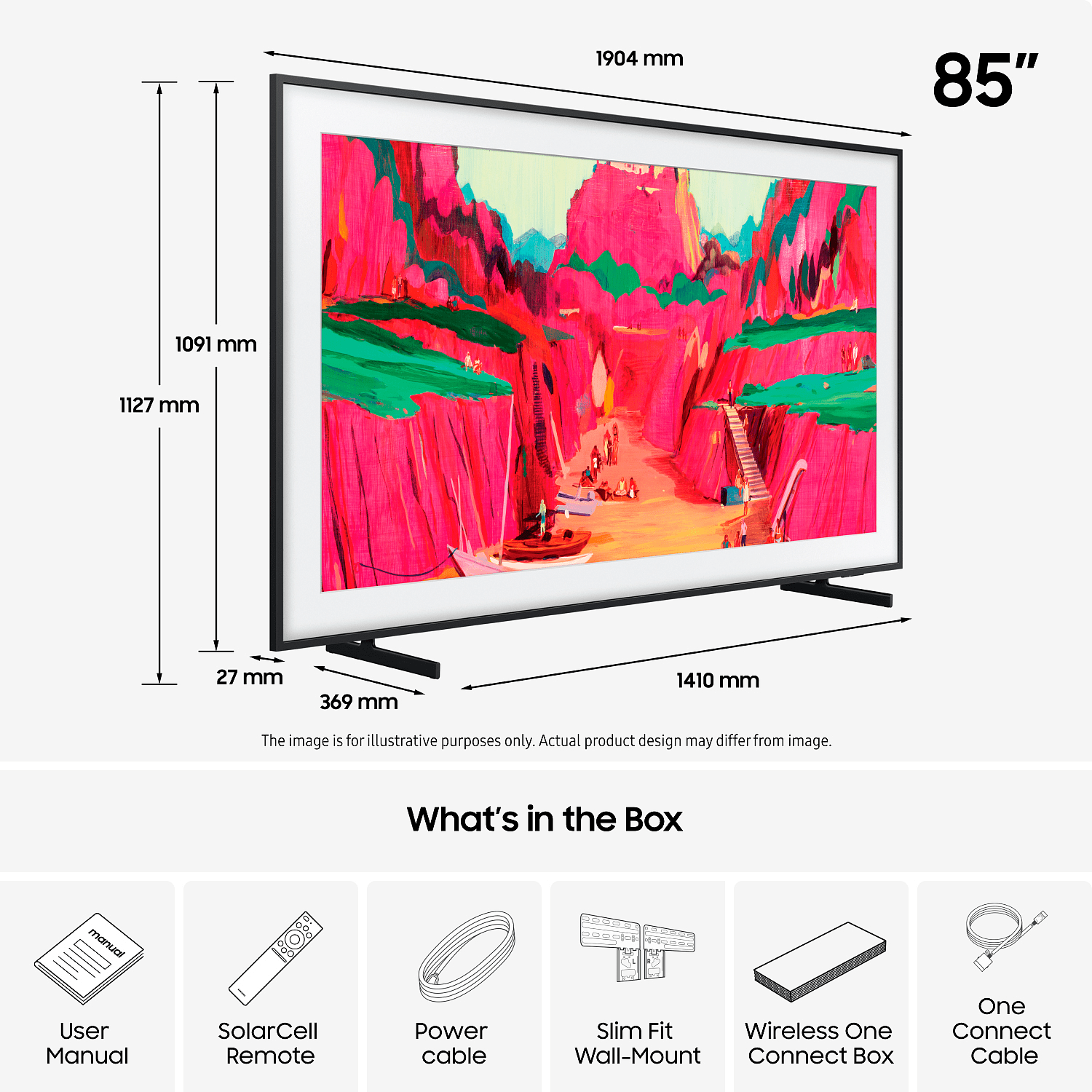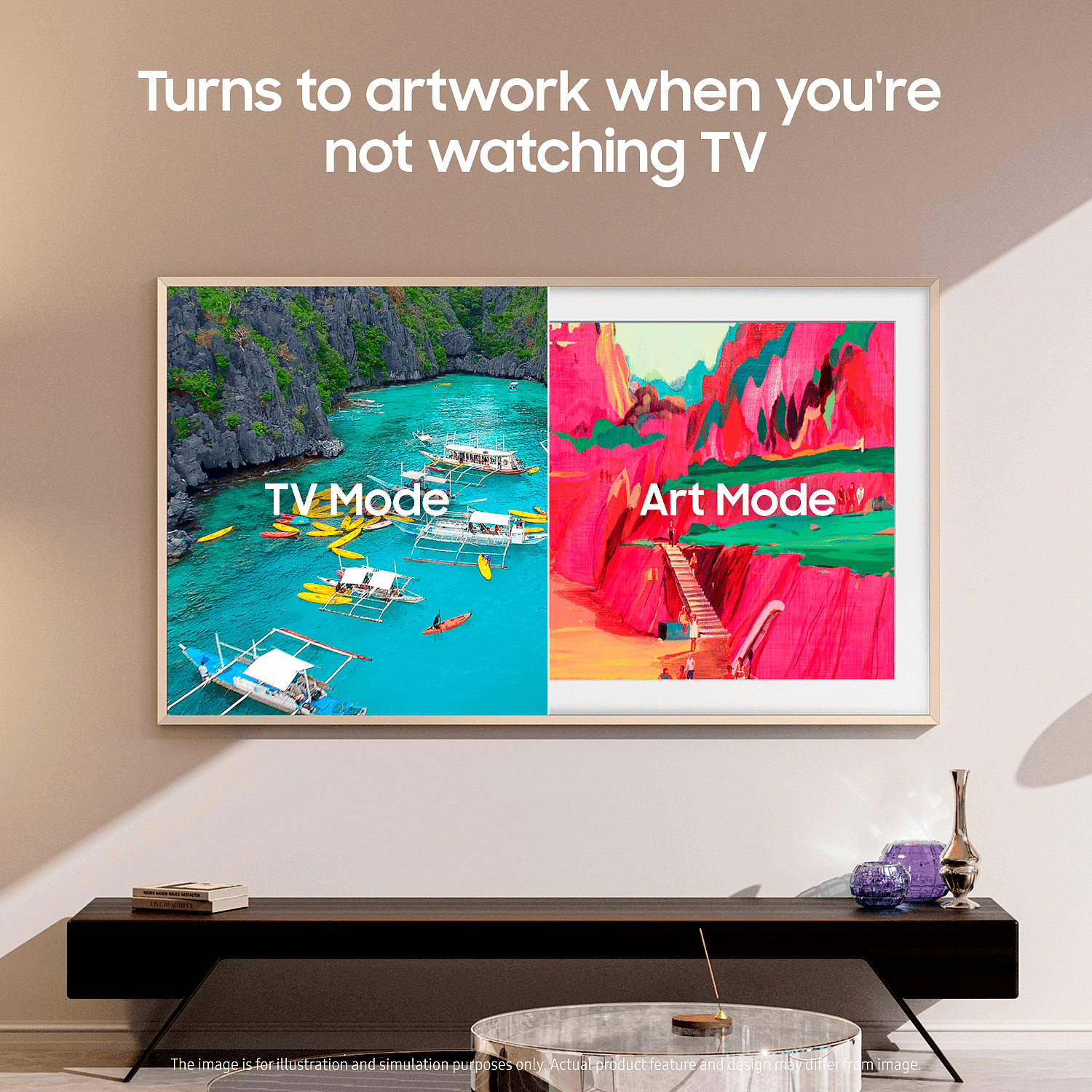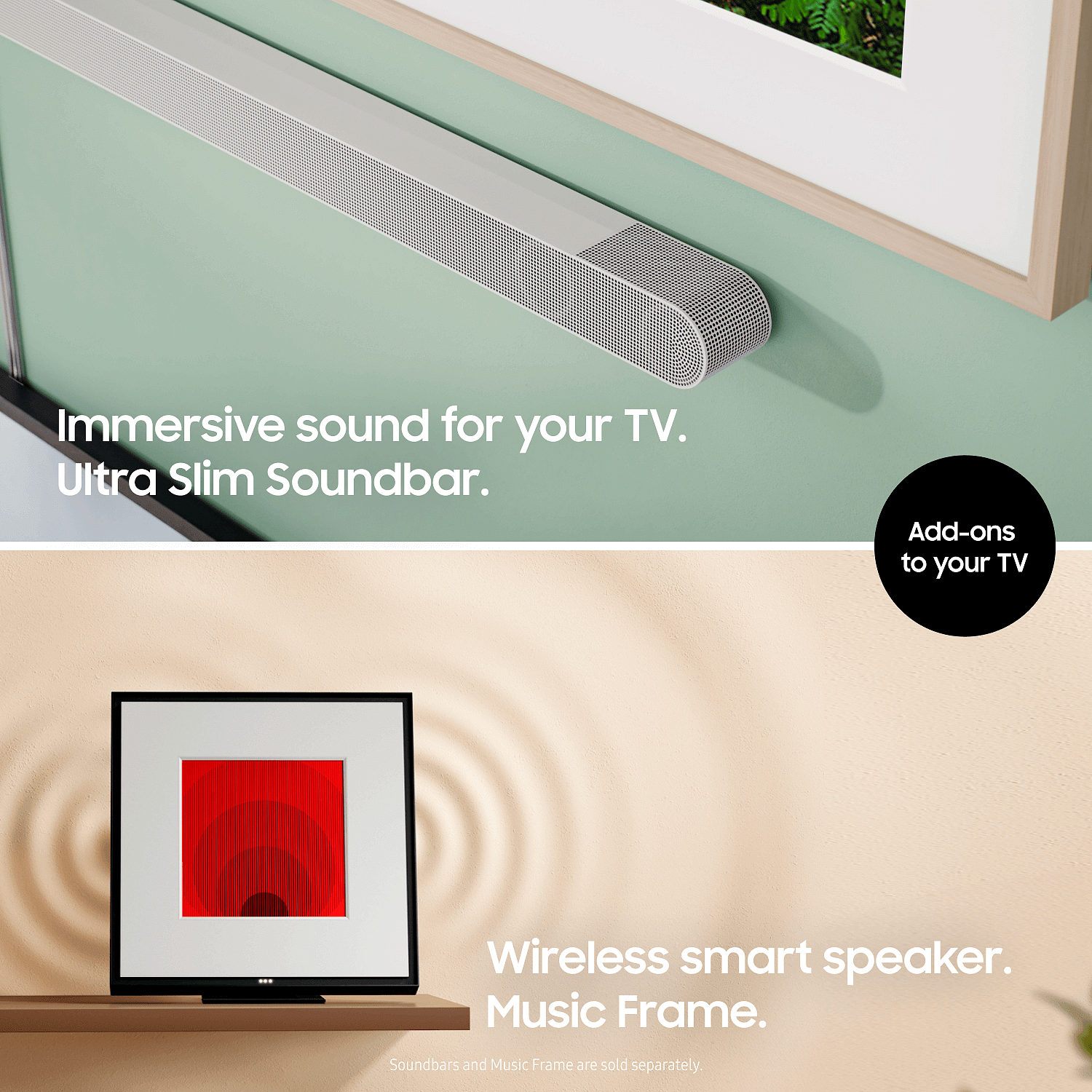 Ohut muotoilu ja Slim Fit -seinäkiinnitys tekevät televisiosta lähes taulun näköisen. Mukautettavat kehykset ja matot antavat mahdollisuuden personoida ulkoasu tilan ja tyylin mukaan. Magneettikiinnitys tekee vaihtamisesta helppoa. Korkeussäädettävä jalusta mahdollistaa täydellisen sijoittelun myös soundbarin kanssa.