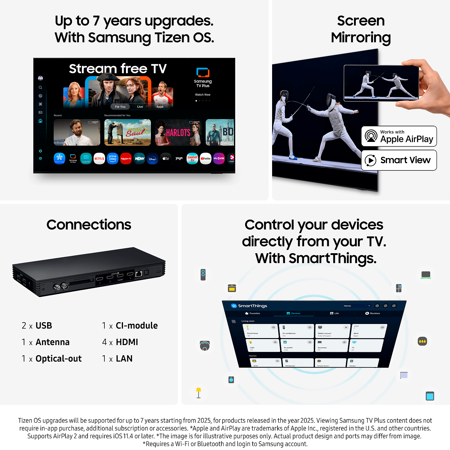 Samsungin Tizen OS tarjoaa sujuvan käyttökokemuksen ja pääsyn suosikkisisältöihin heti käynnistyksestä. Smart Hub kokoaa sovellukset, elokuvat ja sarjat yhteen paikkaan. Samsung TV Plus tarjoaa ilmaista sisältöä, ja Cloud Gaming -tuki mahdollistaa pelaamisen ilman konsolia. SmartThings-sovelluksella voit hallita televisiota, älykodin laitteita ja jopa seurata energiankulutusta.