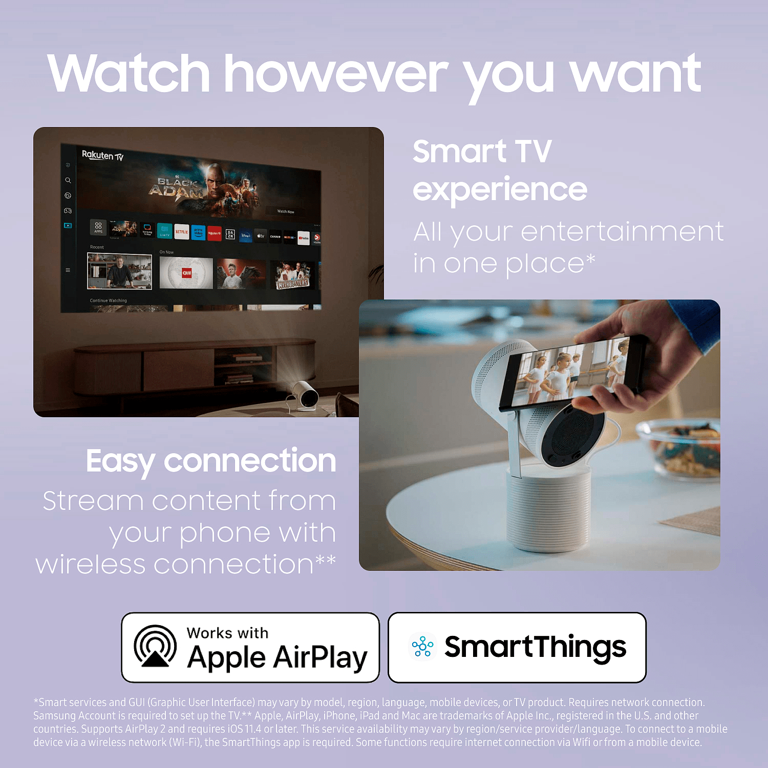 Smart TV -käyttökokemus, ota Samsung Smart TV -käyttökokemus mukaasi kesämökille. Liitä The Freestyle Wi-Fi-verkkoon, niin voit käyttää sovelluksia ja suoratoistopalveluita suoraan laitteelta.