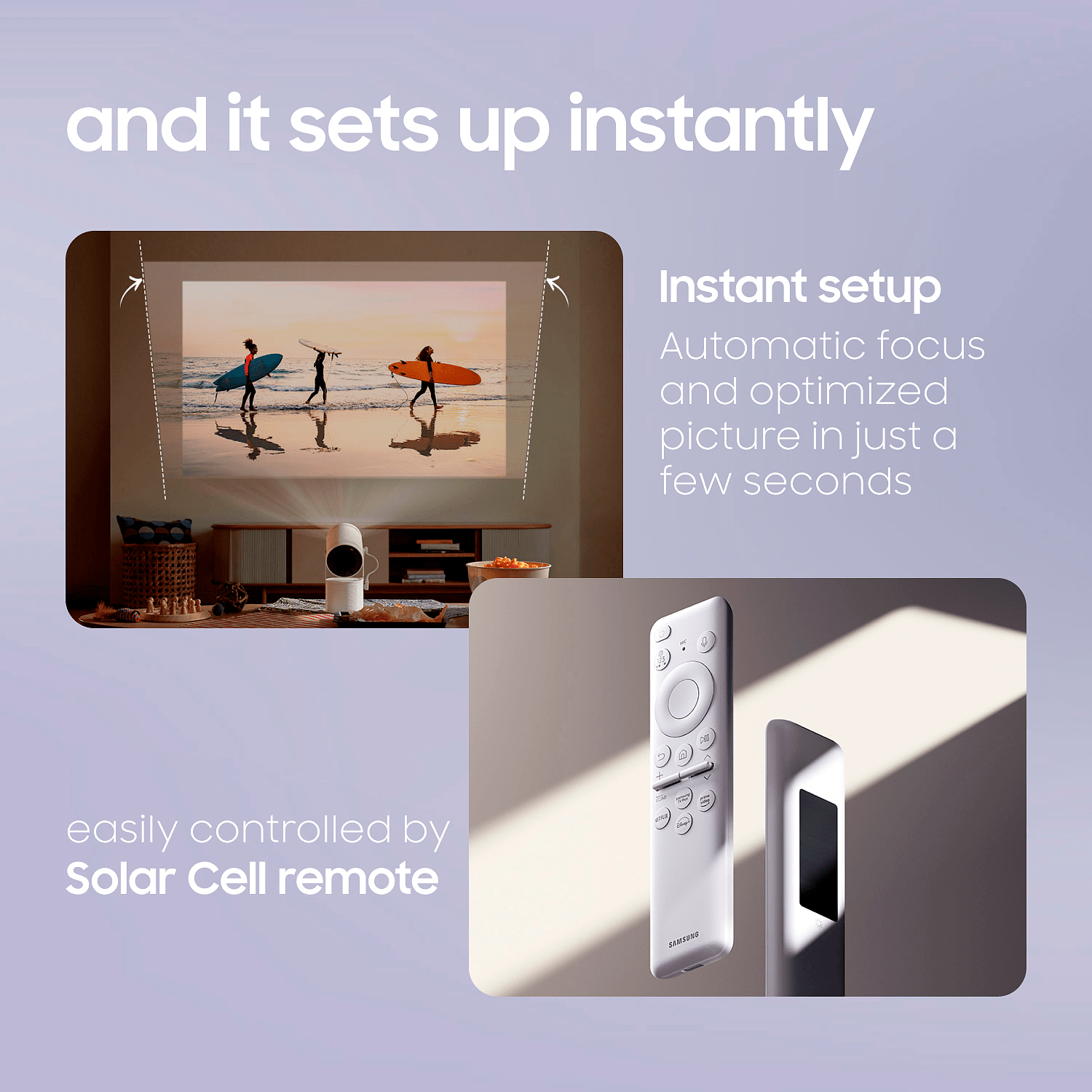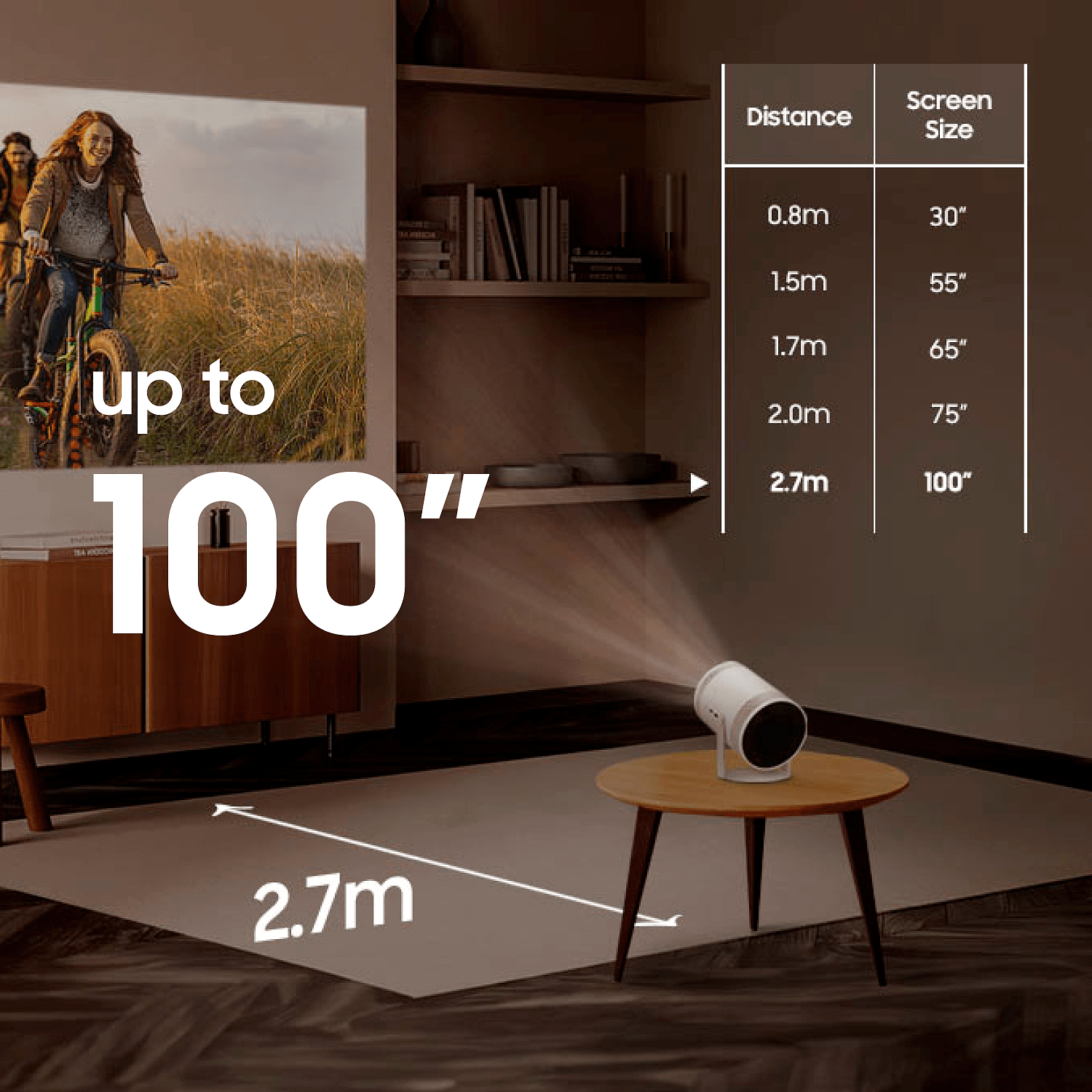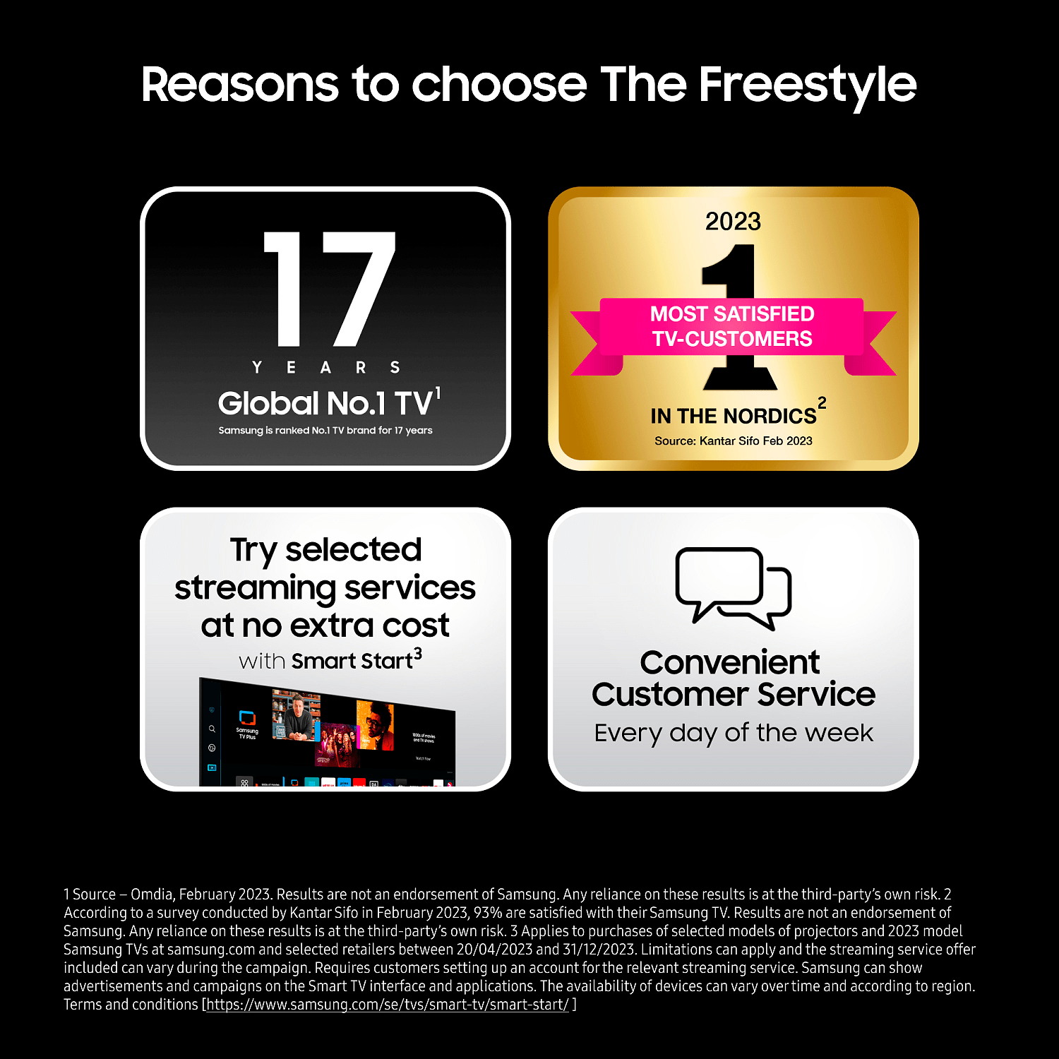 Suosikkisisältösi - missä tahansa. Voit katsella elokuvaa sängystä, heijastaa ruoanlaittovideon keittiön seinälle tai ottaa Smart TV -toiminnot mukaan kesämökille. The Freestylen kompakti muotoilu antaa mahdollisuuden heijastaa kuvan lähes mille tahansa pinnalle. Viihteestä voi siis nauttia suuressa koossa entistä useammissa paikoissa.