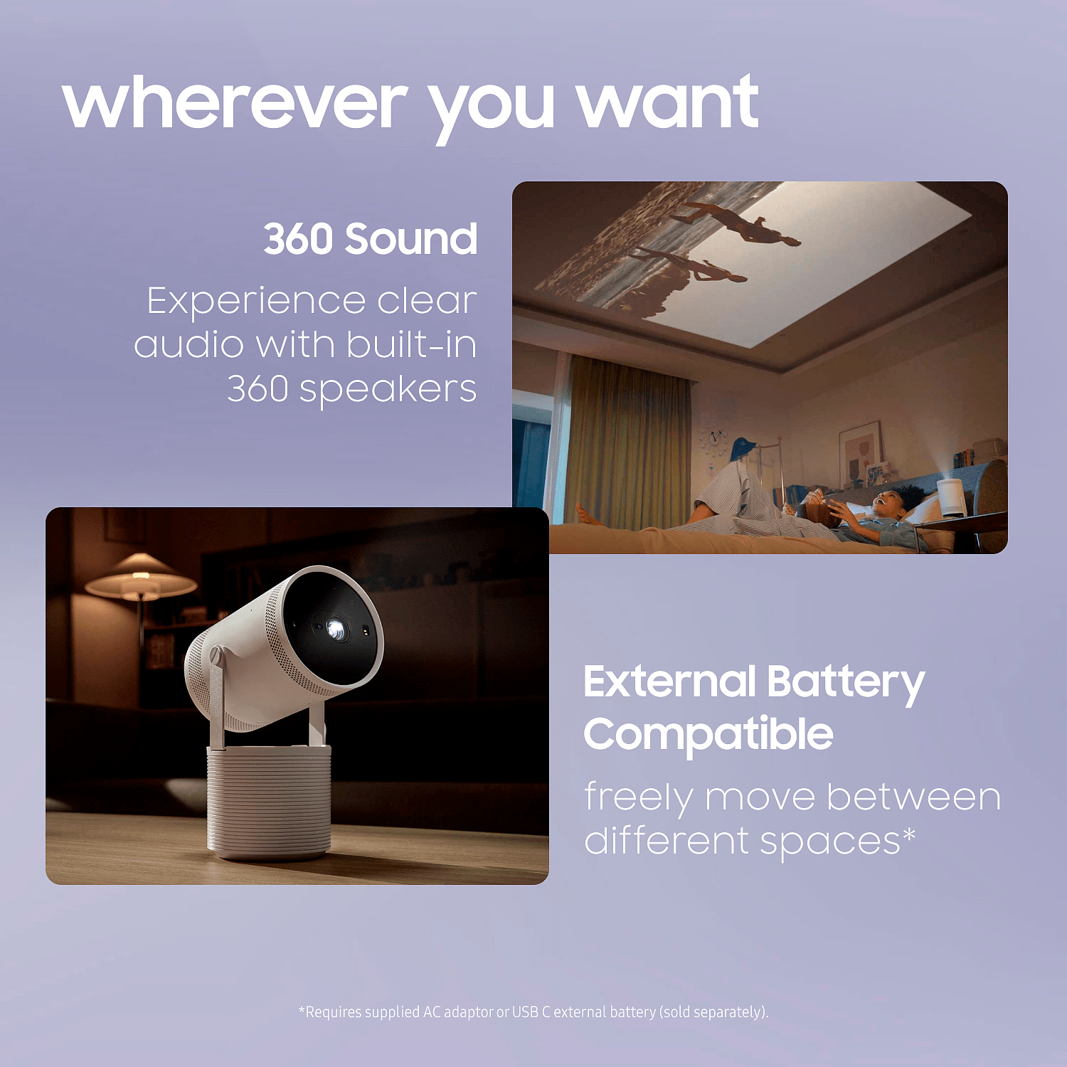 Toimii ulkoisten varavirtalähteiden kanssa, The Freestyle on yhteensopiva ulkoisten varavirtalähteiden kanssa, jotka tukevat USB PD -tekniikkaa ja 50W/20V tai sitä suurempaa lähtötehoa, joten sen voi ottaa mukaan, minne tahansa ja nauttia suurkuvaelämykset, vaikka tähtitaivaan alla telttaretkellä.