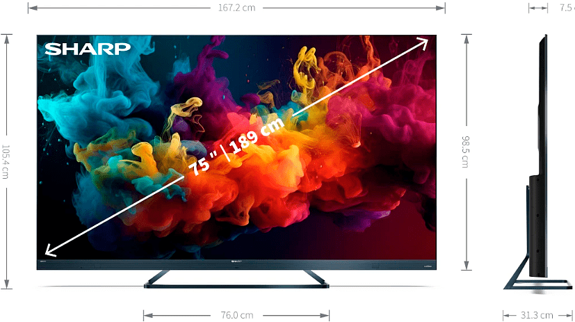 Sharp FQ -sarjan televisioissa on huippuluokan muotoilu ja alumiinirunkoinen rakenne. Tekoälyalgoritmit parantavat kuvanlaatua analysoimalla sisältöä ja optimoimalla kuva-asetuksia, mikä tekee väreistä luonnollisempia ja yksityiskohdista terävämpiä.