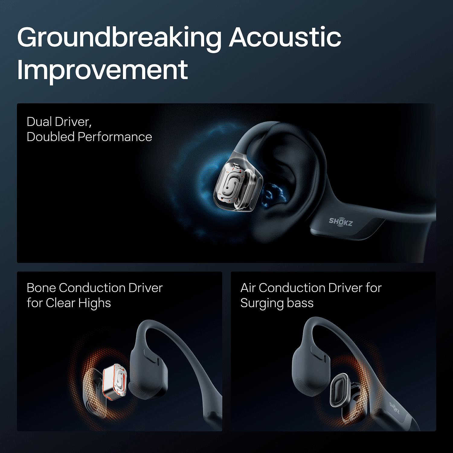 Shokz OpenRun Pro 2 -luujohtokuulokkeet yhdistävät luujohde- ja ilmajohdeteknologiat, tarjoten vertaansa vailla olevan kuuntelukokemuksen. Poskipäille asetettavat kuulokkeet välittävät äänen värähtelyinä sisäkorvaan, tuottaen selkeät sävelet. Ilmajohdeteknologia puolestaan käyttää matalataajuuskaiutinta syvien bassosävelten tuottamiseen.