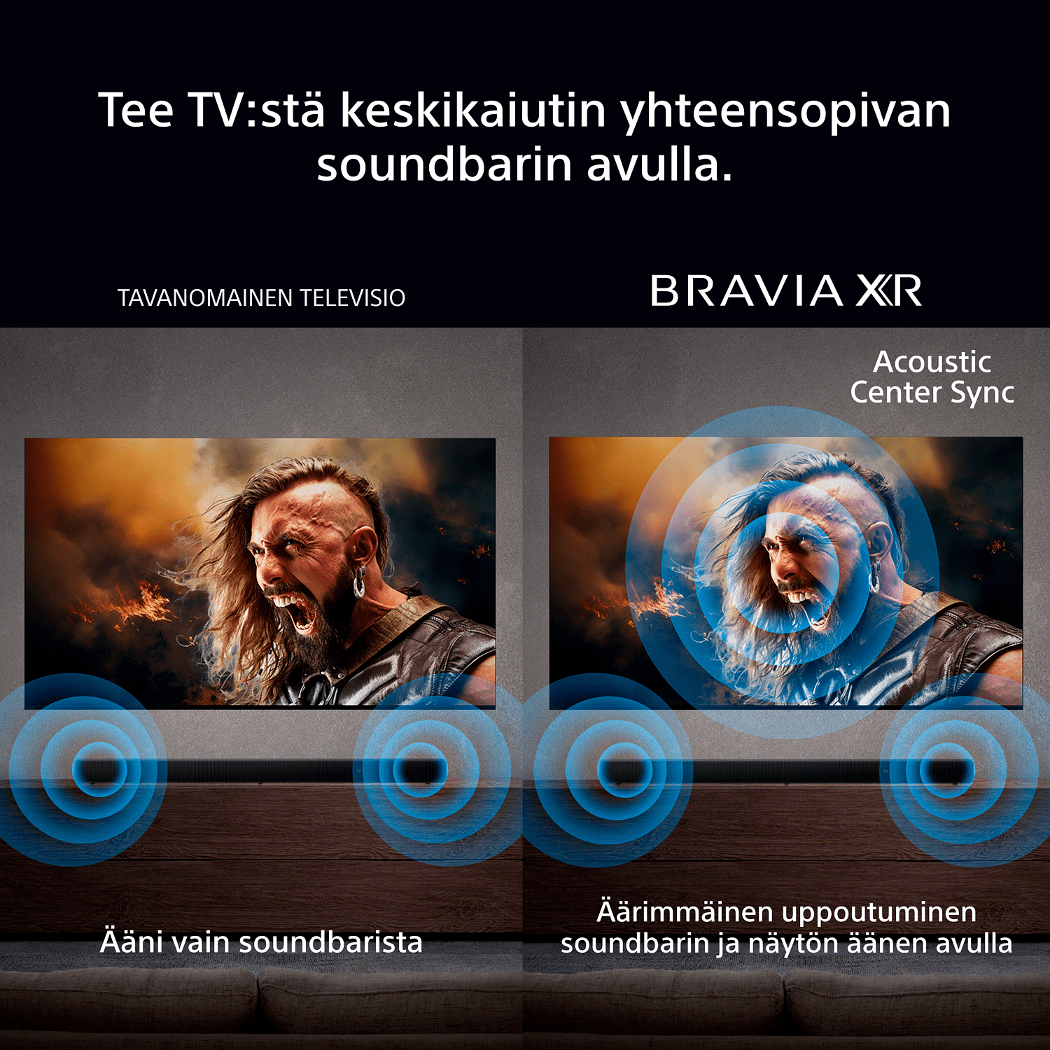 Saat vielä enemmän jännitystä lisäämällä yhden yhteensopivista äänirajoistamme. Acoustic Centre Sync tekee televisiosta keskikaiuttimen, joka mahdollistaa maksimaalisen uppoutumisen, 360 Spatial Sound Mapping -tekniikka luo fantomakaiuttimet elokuvateatterin kaltaiseen asetteluun ympärillesi ja paljon muuta.