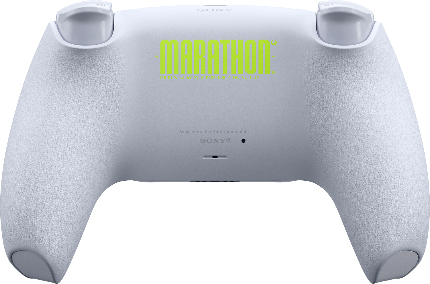 Valkoinen perusväri yhdistettynä mustiin ja neonvihreisiin yksityiskohtiin sekä pelin logografiikkaan tekee ohjaimesta näyttävän keräilykappaleen. Takana näkyy myös tyylikäs neon‑tekstillä toteutettu Marathon‑brändäys.
