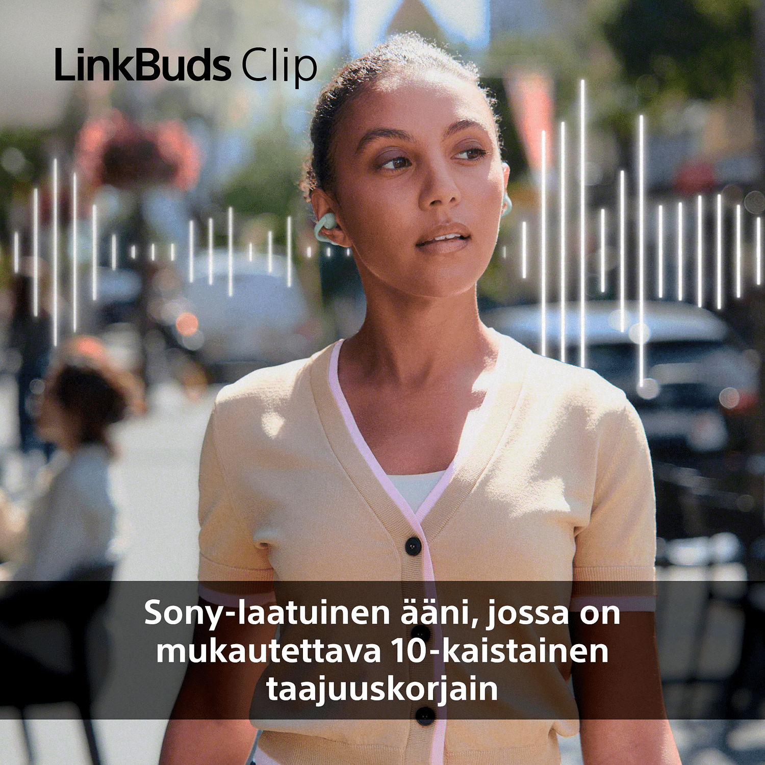 Toisin kuin perinteiset in‑ear‑kuulokkeet, LinkBuds Clip ei peitä korvakäytävää. Voit seurata keskusteluja, kuulla liikenteen ja silti nauttia tasapainoisesta ja selkeästä äänestä. Tämä tekee niistä erinomaiset kuulokkeet kaupunkiin, toimistoon ja ulkoiluun.