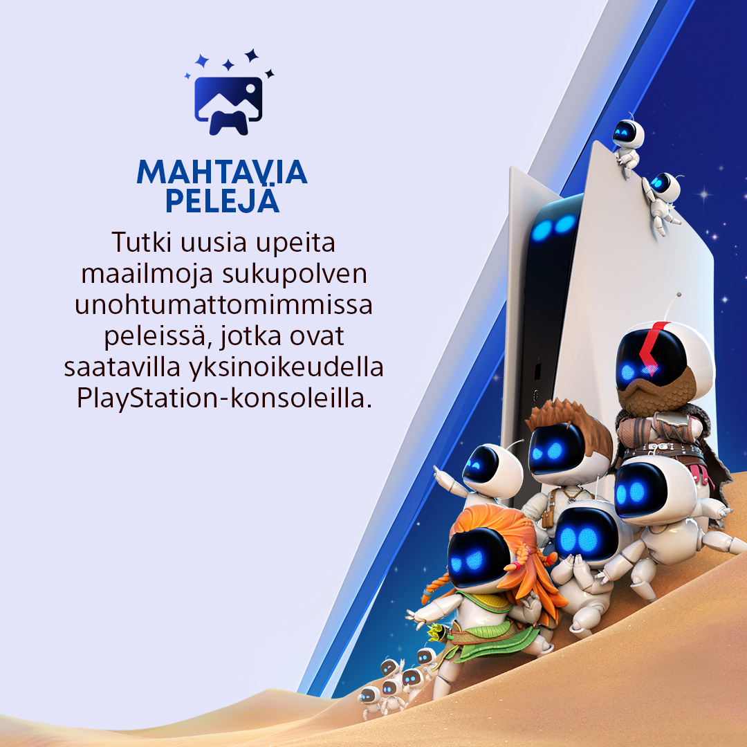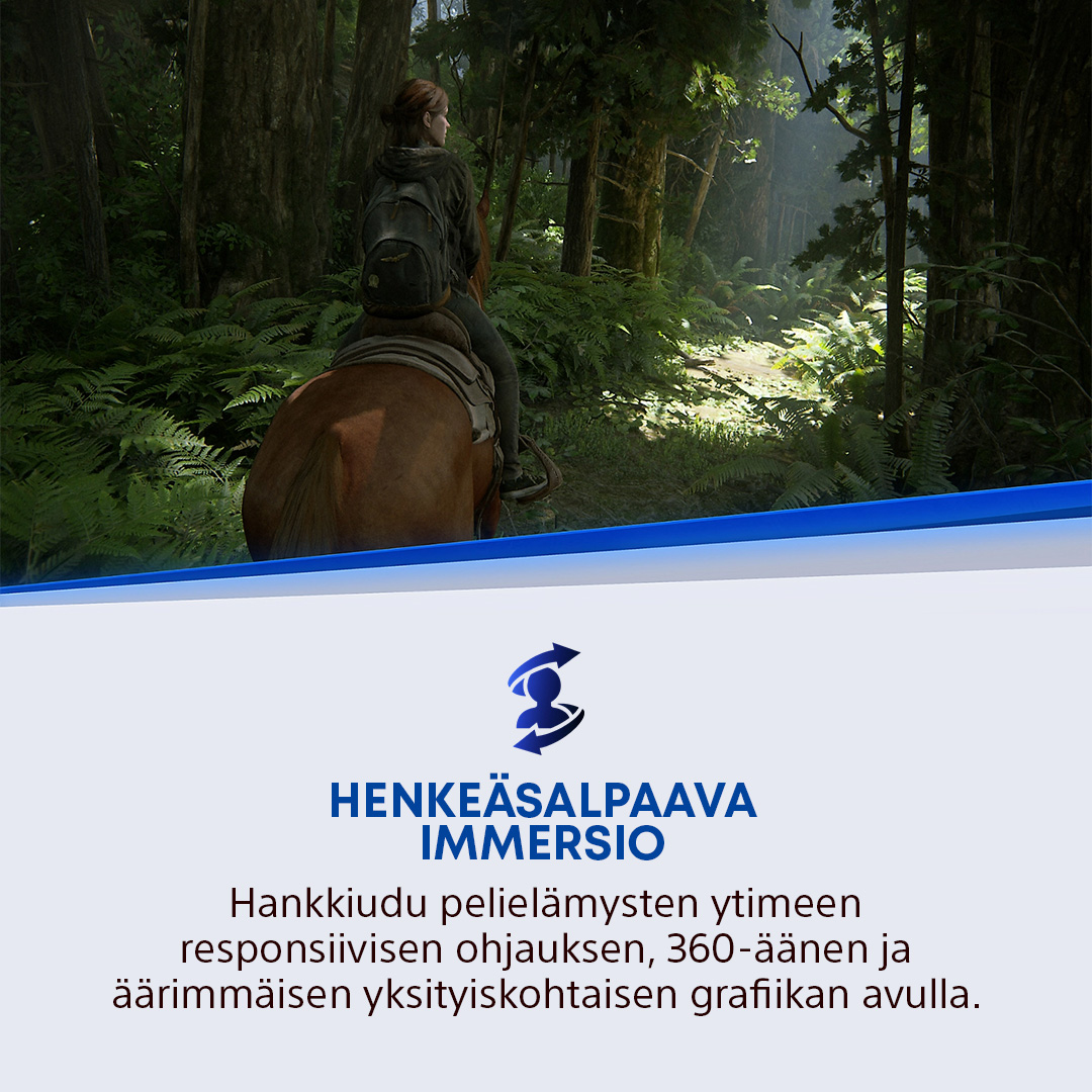 • Koe DualSense -ohjaimen kosketuspalaute, mukautuvat liipaisimet ja 3D-äänitekniikka, ne vievät sinut syvemmälle pelien tunnelmaan.