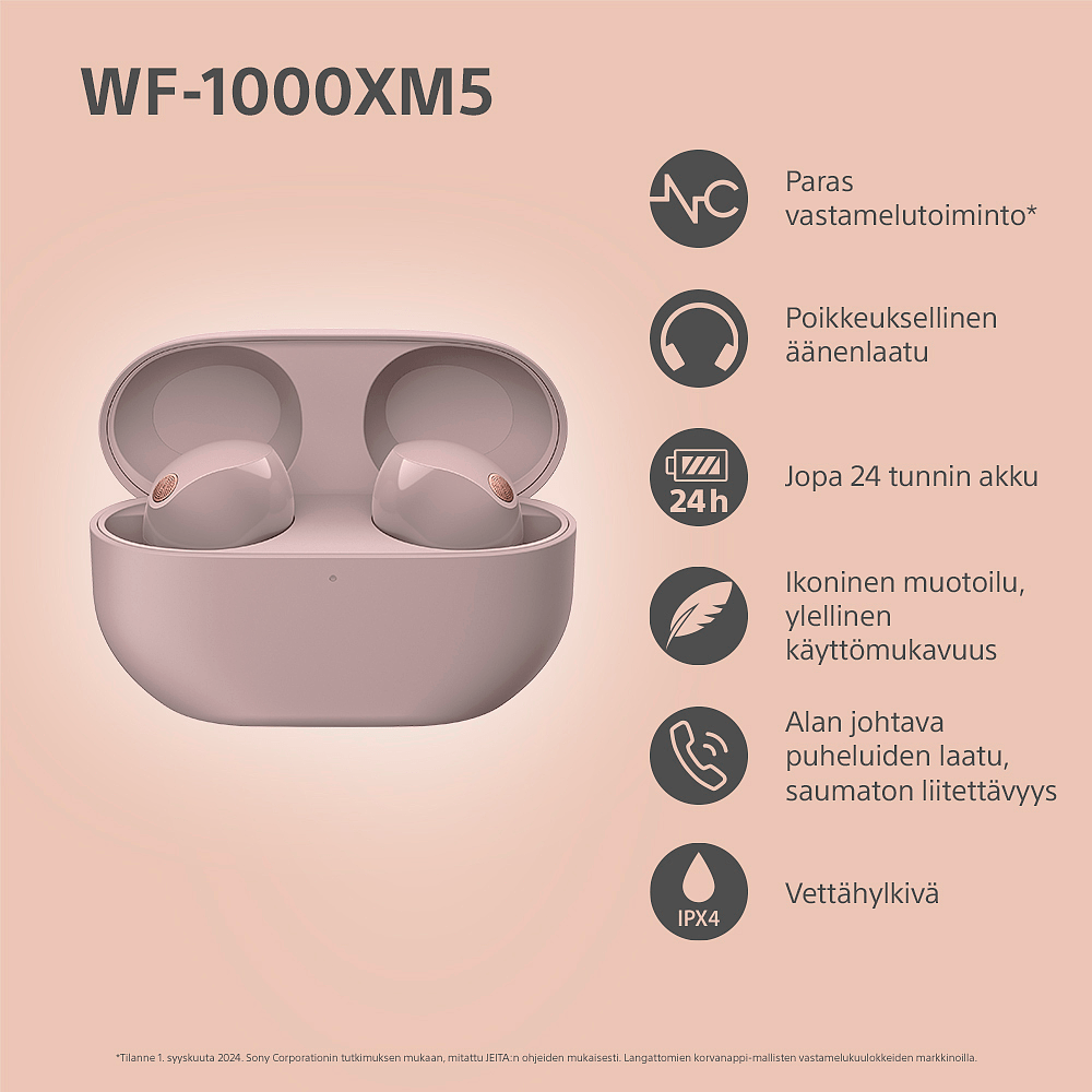 WF-1000XM5 sopivat myös lenkkeily- tai kuntosalikuulokkeiksi, sillä niissä on IPX4-vedenkestävyysluokitus. Se tarkoittaa, että roiskeet ja hiki eivät pysäytä niitä - voit siis jatkaa liikkumista musiikin tahdissa.