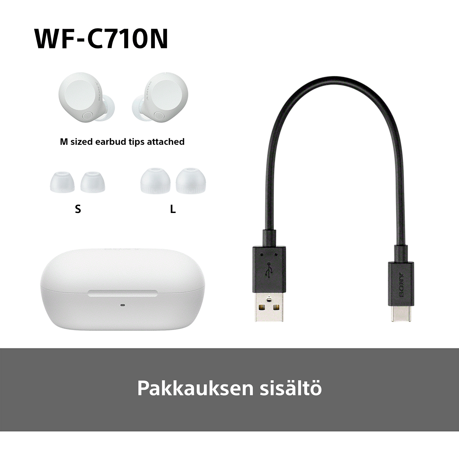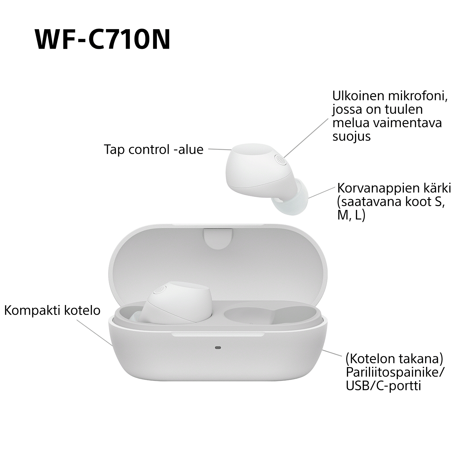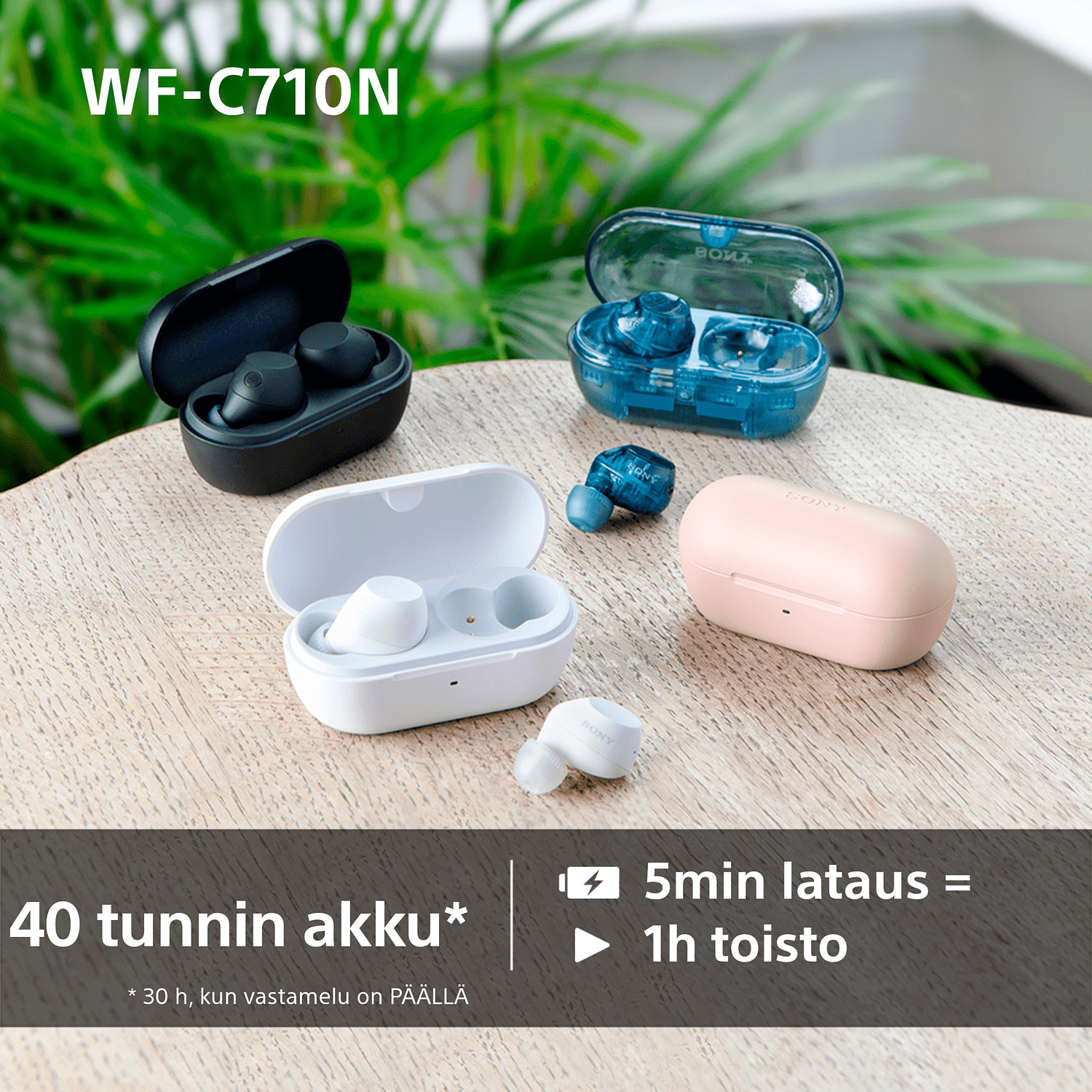 WF-C710N on saatavana väreissä musta, valkoinen, pinkki ja glass blue (jännittävä läpinäkyvä muotoilu). WF-C710N -korvanapit ovat pienet, kevyet ja mukavat, joten voit käyttää niitä koko päivän ja keskittyä musiikkiin tyylillä.