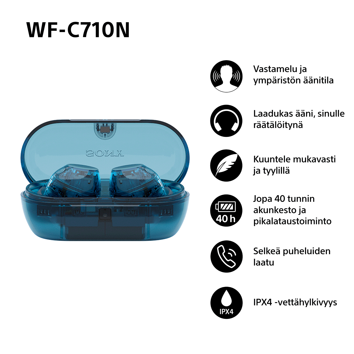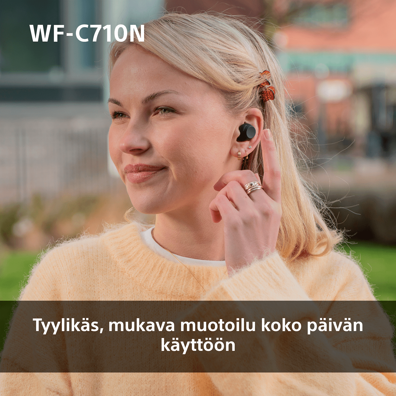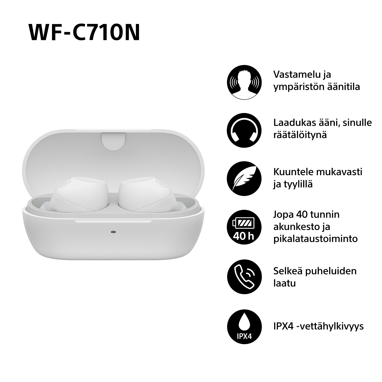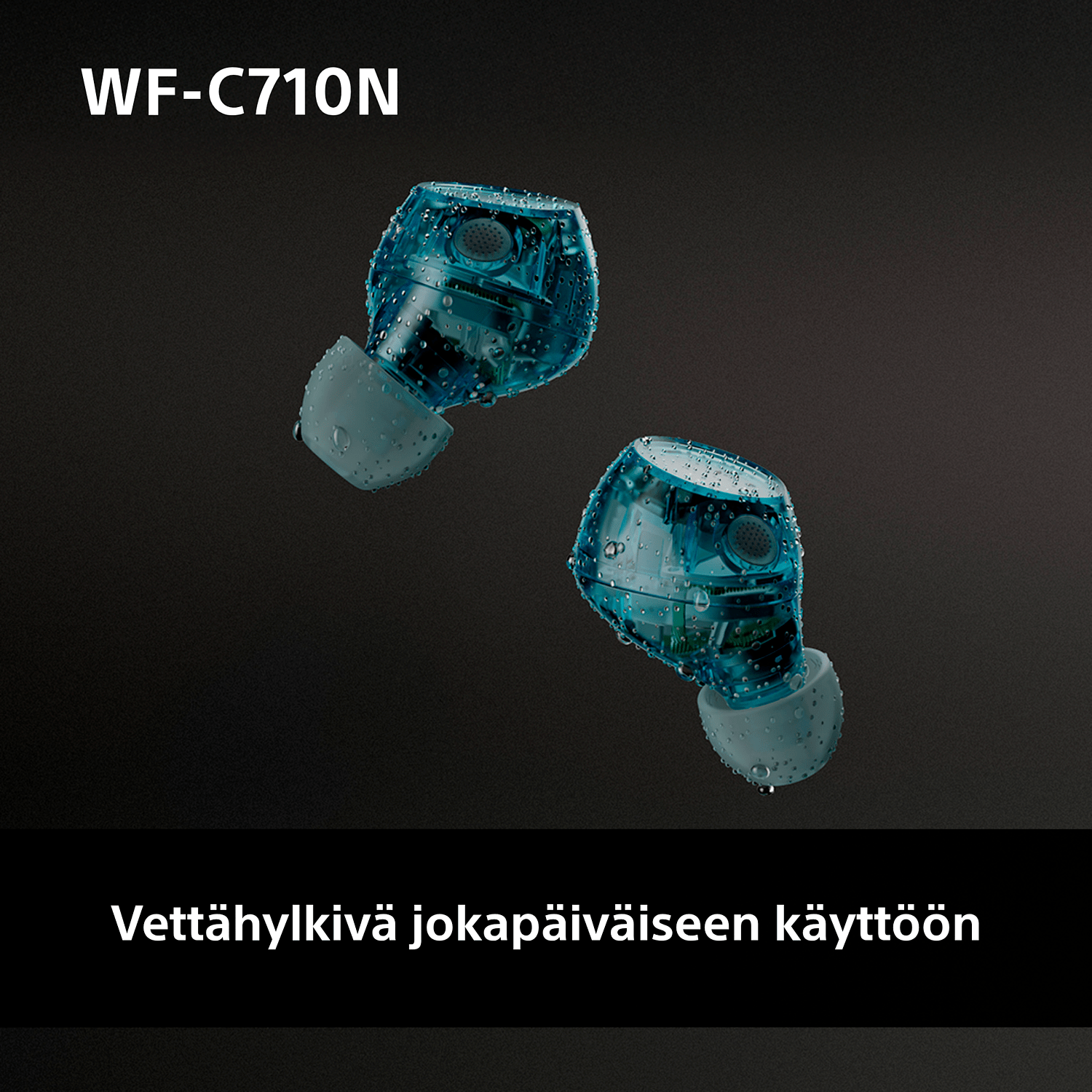 WF-C710N -korvanappien vettähylkivyysluokitus on IPX4. Kuulokkeet siis kestävät hikeä ja sadetta, joten voit käyttää niitä sisätiloissa ja ulkona luottavaisin mielin.