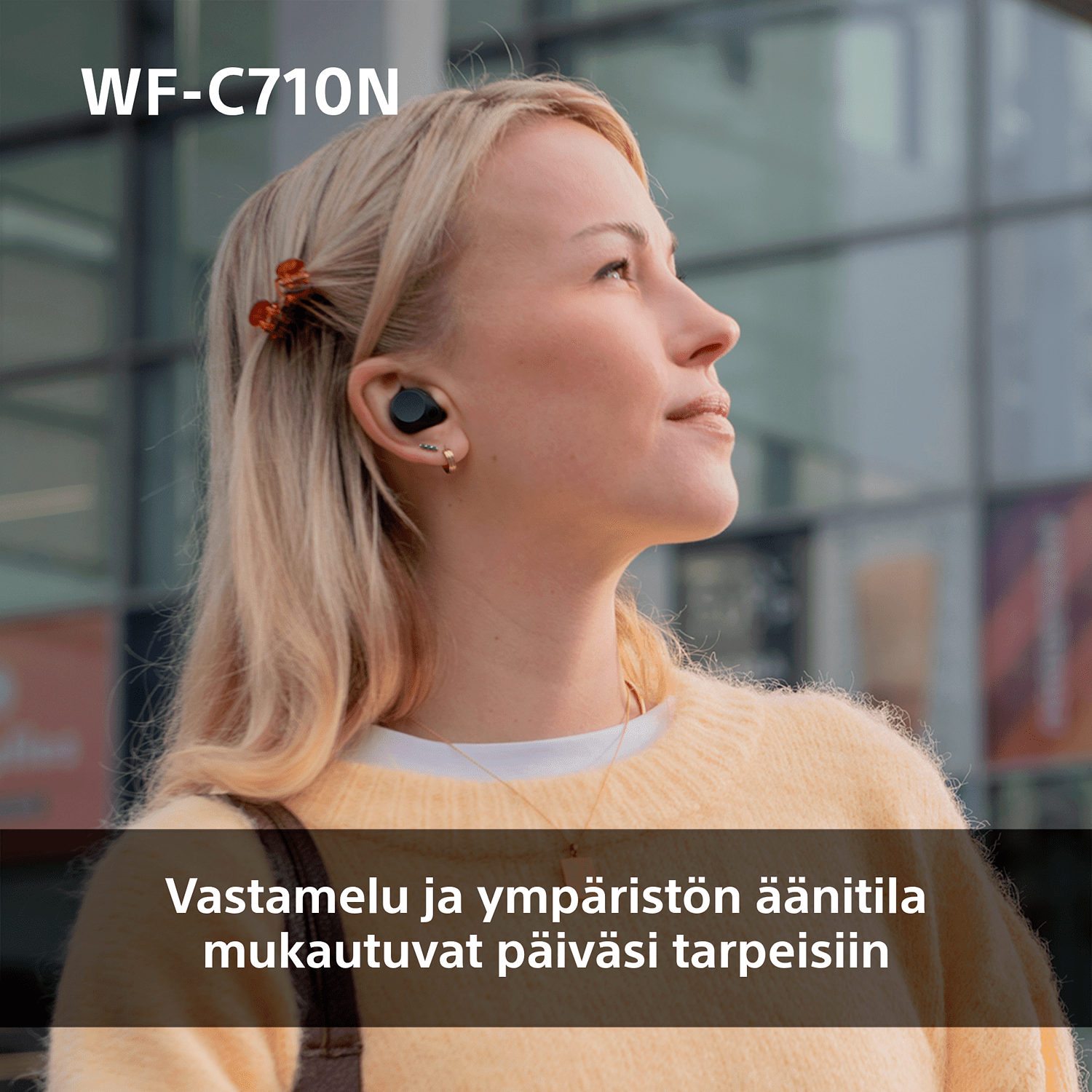 Hiljennä ympäristö ja uppoudu musiikkiin WF-C710N -korvanapeilla. Kummassakin kuulokkeessa on kaksi mikrofonia, jotka havaitsevat ja vaimentavat ei-toivottua melua sekä kuulokkeen sisältä että ulkopuolelta, mikä takaa tehokkaan vastamelukokemuksen. Vaihtoehtoisesti ympäristön äänitilalla voit pysyä yhteydessä ympäristöösi, sillä se tarjoaa läpinäkyvän kuuntelukokemuksen, joka pitää sinut tietoisena ympäristöstäsi samalla kun nautit musiikista. Olitpa sitten kuntosalilla, kahvilassa tai matkalla töihin, WF-C710N antaa sinun keskittyä olennaiseen.