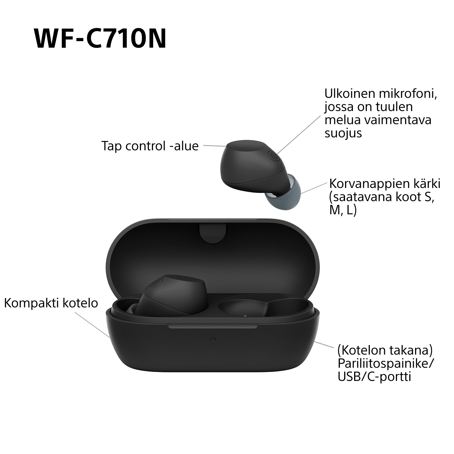 WF-C710N on saatavana väreissä musta, valkoinen, pinkki ja glass blue (jännittävä läpinäkyvä muotoilu). WF-C710N -korvanapit ovat pienet, kevyet ja mukavat, joten voit käyttää niitä koko päivän ja keskittyä musiikkiin tyylillä.