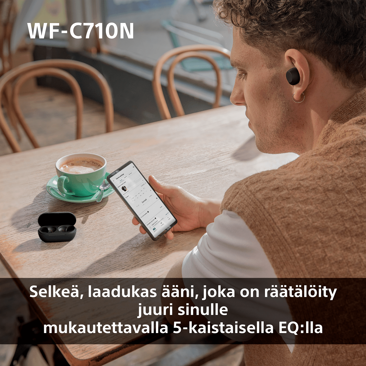 Selkeän laulun, voimakkaan basson ja täyteläisen tasapainoisen äänen ansiosta voit nauttia monenlaisesta musiikista WF-C710N -korvanapeilla. Kuulokkeissa on Digital Sound Enhancement Engine (DSEE), joka parantaa digitaalisen musiikin äänenlaatua lähemmäs alkuperäistä äänitettä. Sony | Sound Connect -sovelluksen mukautetulla taajuuskorjaimella voit räätälöidä äänen oman makusi mukaan vahvistamalla tai vähentämällä tiettyjä äänielementtejä, kuten lisäämällä bassoa rikkaamman ja syvemmän äänen aikaansaamiseksi tai vahvistamalla diskanttia selkeyden ja yksityiskohtien lisäämiseksi. Vaihtoehtoisesti voit valita jonkin esiasetuksista löytääksesi itsellesi parhaan mahdollisen äänen.