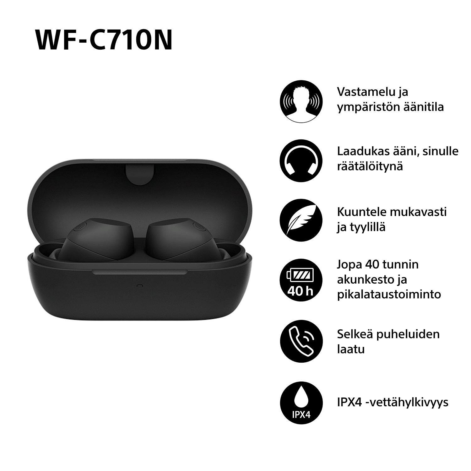 WF-C710N -korvanappien vettähylkivyysluokitus on IPX4. Kuulokkeet siis kestävät hikeä ja sadetta, joten voit käyttää niitä sisätiloissa ja ulkona luottavaisin mielin.