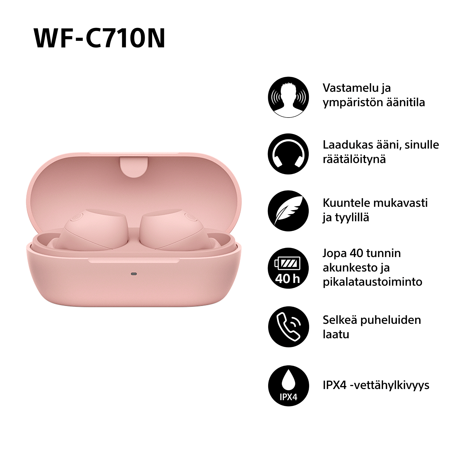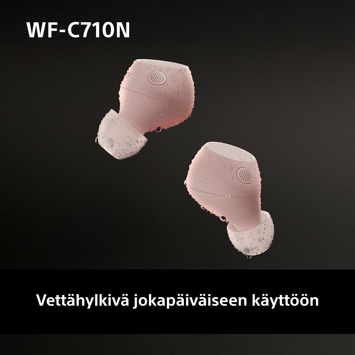 WF-C710N -korvanappien vettähylkivyysluokitus on IPX4. Kuulokkeet siis kestävät hikeä ja sadetta, joten voit käyttää niitä sisätiloissa ja ulkona luottavaisin mielin.