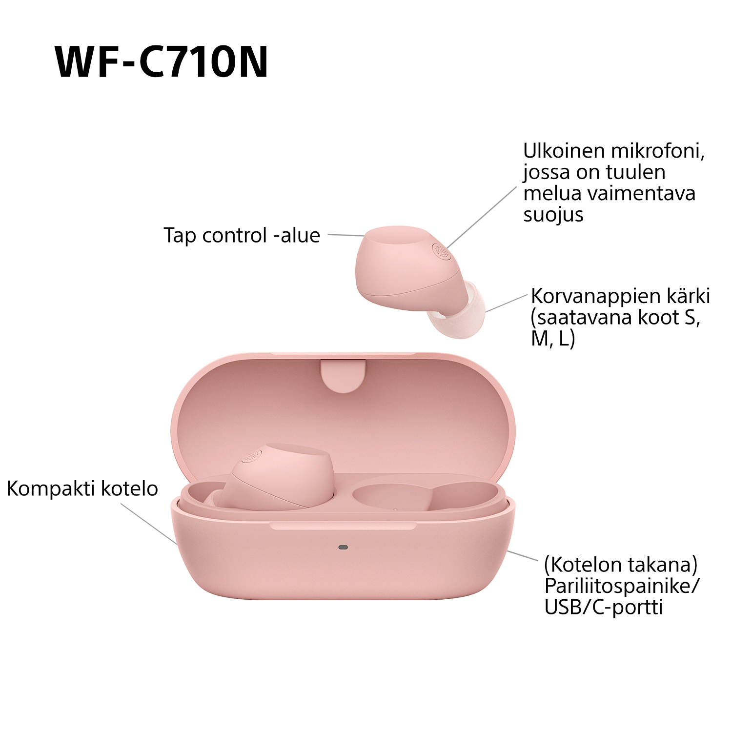 WF-C710N on saatavana väreissä musta, valkoinen, pinkki ja glass blue (jännittävä läpinäkyvä muotoilu). WF-C710N -korvanapit ovat pienet, kevyet ja mukavat, joten voit käyttää niitä koko päivän ja keskittyä musiikkiin tyylillä.