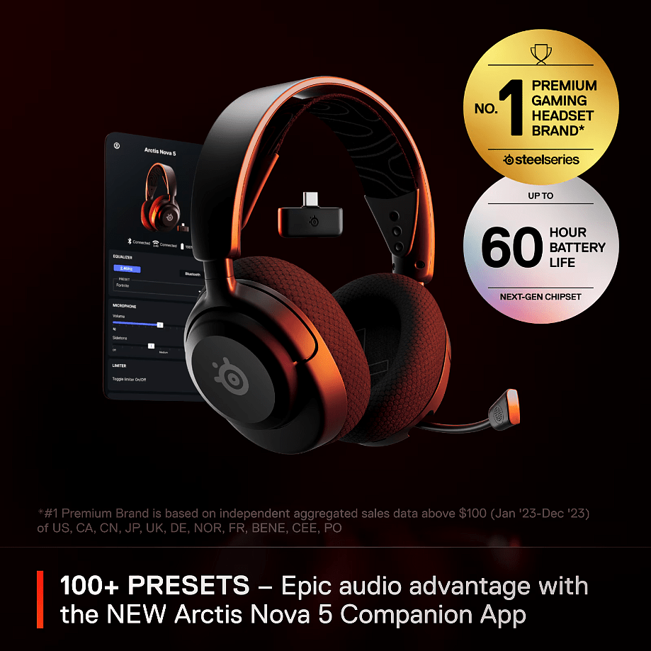 Tutustu Arctis Nova 5 -pelikuulokkeisiin, jotka tarjoavat huipputason äänentoiston suosikkipeleillesi. Yli 100 peliäänen esiasetusta Arctis Nova 5 Companion App -sovelluksessa mahdollistavat äänen räätälöinnin tarpeidesi mukaan.