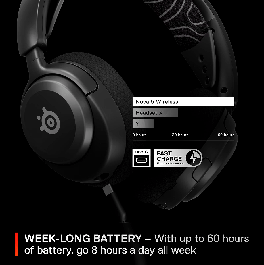Nämä pelikuulokkeet tarjoavat 60 tunnin akunkeston, joten voit pelata viikon ilman latausta. Nopea USB-C-lataus takaa, että kuulokkeet ovat aina valmiina seuraavaan pelisessioon.