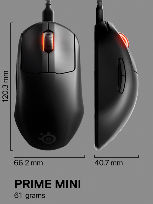 Prime Mini on suunniteltu huolellisesti 12 % kevyemmäksi ja pieniprofiilisemmaksi, mutta siinä on edelleen Primelle tunnusomainen ergonominen muoto ja huipputeknologiaa, jotka tekevät Primen hiiristä e-urheiluun soveltuvia.