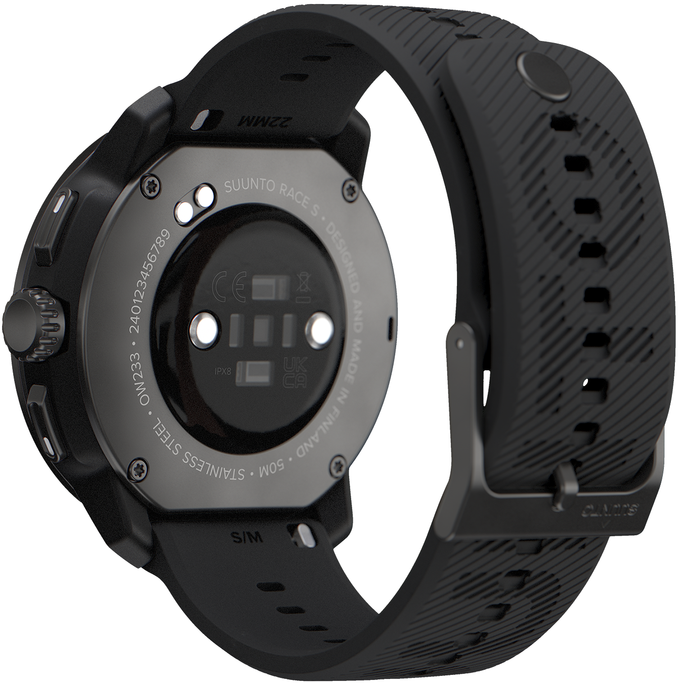 Suunto Race S antaa sinulle työkalut valmistautua kisaan tai haasteeseen ja tukee harjoittelun ja palautumisen tasapainoa. Suunto Race S, kuten alkuperäinen Suunto Race, on täydellinen ulkoiluun: seuraa huippuvoimaa pyöräillessä, automaattinen intervallitunnistus uinnissa tai reitin seuranta polkujuoksussa. Yli 95 eri urheilutilan ansiosta kello on valmis kaikkeen urheiluun. Lisäksi ominaisuudet kuten reitin navigointi ja "murupolku" ohjaavat sinua reiteillä, joten voit keskittyä kilpailuun tai harjoitteluun pelkäämättä eksymistä.