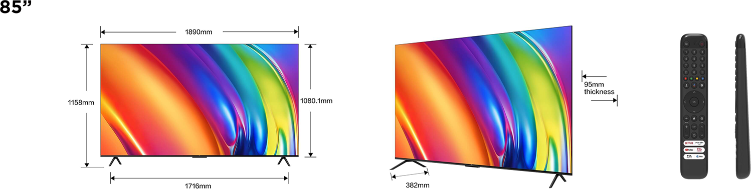 TCL P745 4K LED -älytelevisio on moderni ja siinä on reunaton muotoilu. Se on varustettu Dynamic Color Enhancement -teknologialla ja AiPQ 3.0 -prosessorilla, joka tarjoaa miljardeja värejä ja sävyjä, joita Dolby Atmos -teknologia täydentää. Google TV -järjestelmän ansiosta sinulla on käytettävissä erilaisia viihdealustoja ja yksilöllisiä suosituksia. P745-älytelevisiossa on sisäänrakennettu Google Assistant, joten voit ohjata televisiota tai muita yhteensopivia kodinälylaitteita yksinkertaisesti äänelläsi.