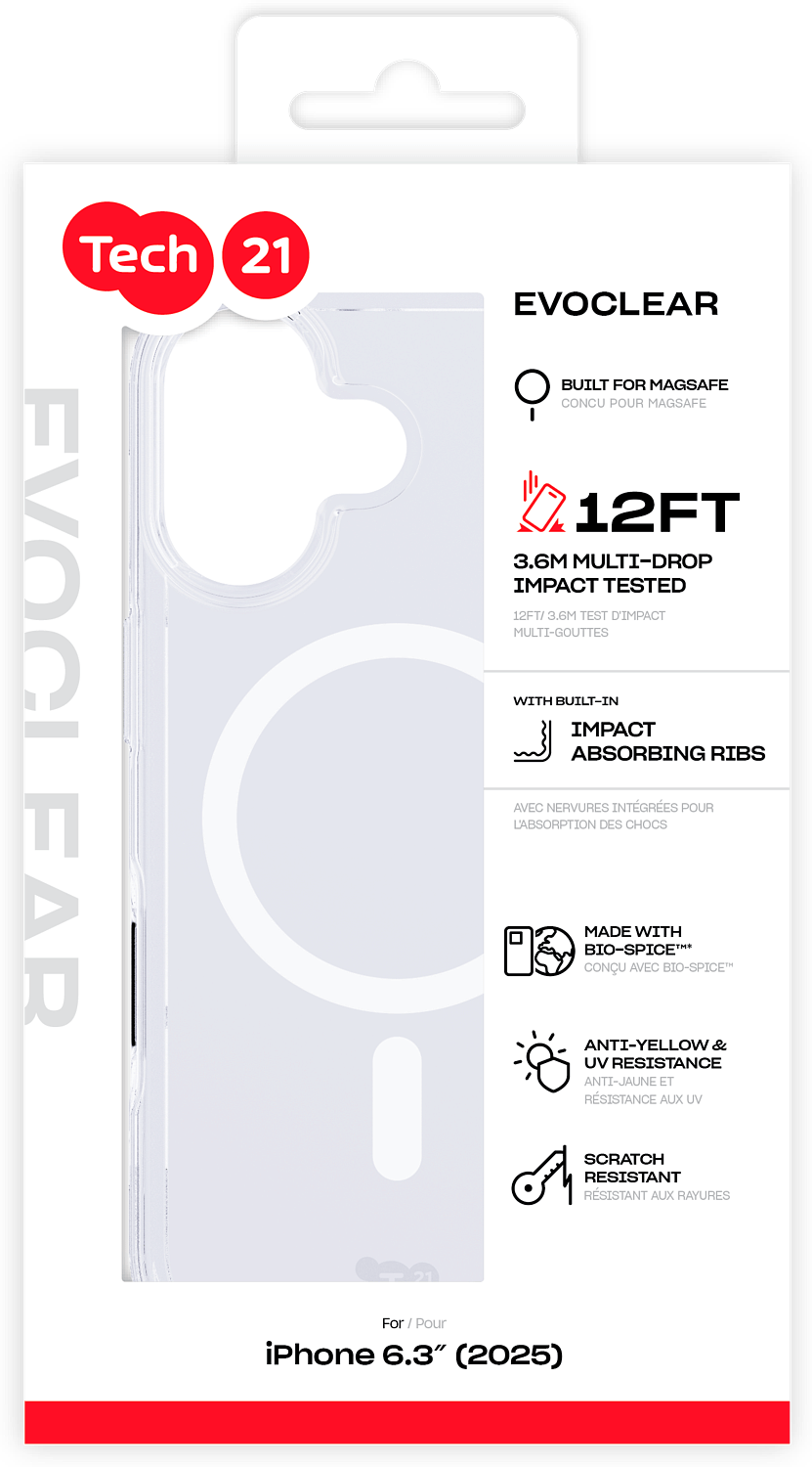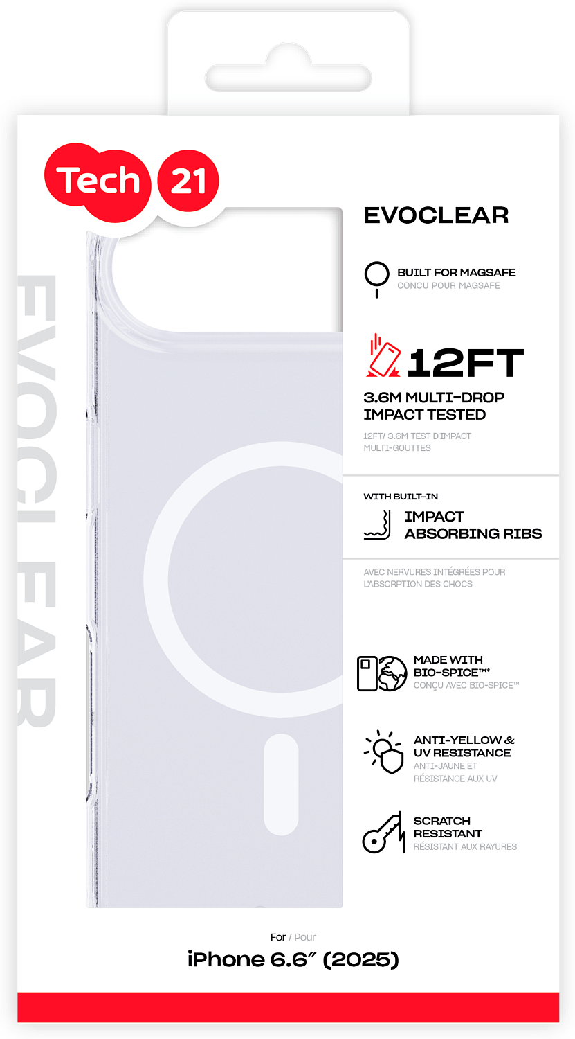 EvoClear MagSafe iPhone 17 -sarjalle tarjoaa äärimmäistä kirkkautta ja luotettavaa suojaa. Iskuja vaimentavien reunojen ansiosta kotelo suojaa laitetta jopa 3,6 metrin pudotuksilta. Evo Clear -kotelon ansiosta laitteesi kestää päivittäiset iskut ja pudotukset, kerta toisensa jälkeen, päivästä toiseen.