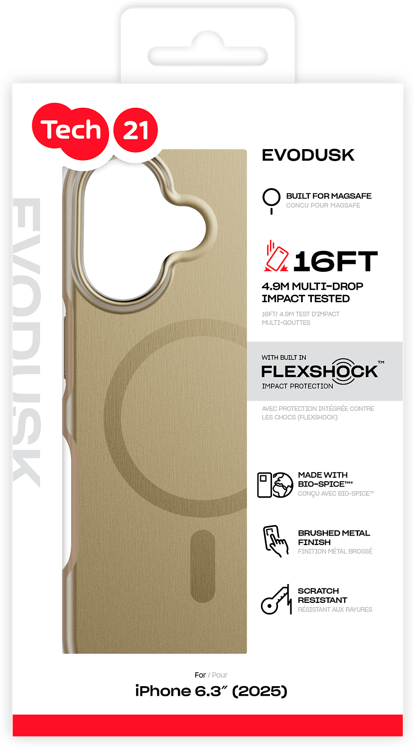 EvoDusk iPhone 17 -sarjaan yhdistää ammattimaisen suojan ja hienostuneen muotoilun. Valmistettu FlexShock -materiaalista, se tarjoaa 4,9 metrin monipudotussuojan, joka absorboi ja hajottaa iskun voiman pitääkseen puhelimesi turvassa putoamisen jälkeen.
