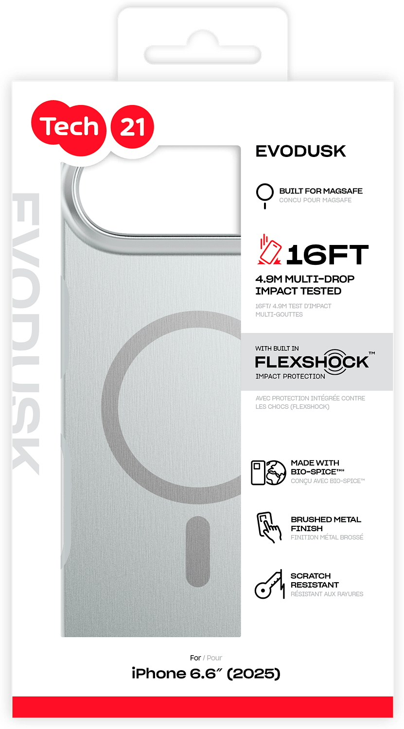 EvoDusk iPhone 17 -sarjaan yhdistää ammattimaisen suojan ja hienostuneen muotoilun. Valmistettu FlexShock -materiaalista, se tarjoaa 4,9 metrin monipudotussuojan, joka absorboi ja hajottaa iskun voiman pitääkseen puhelimesi turvassa putoamisen jälkeen.
