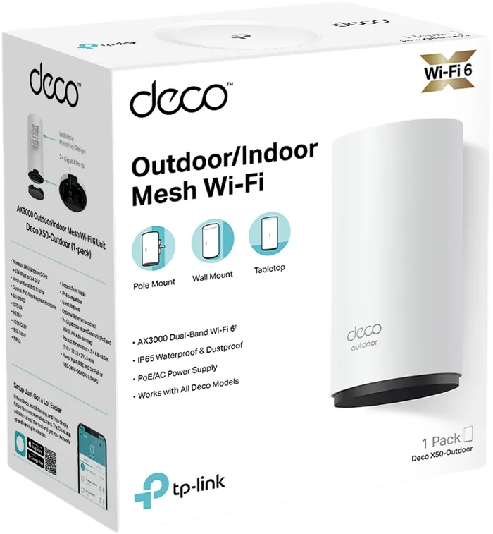 Nauti entistä nopeammasta ja vakaammasta verkkoyhteydestä ulkona tai sisällä. TP-Link Deco X50-Outdoor on ratkaisu, joka vie langattoman verkkosi seuraavalle tasolle. Laiteen säänkestävän rakenteen ansiosta se voidaan sijoittaa vaikka ulos tai piharakennukseen. Laite on IP65-luokiteltu.