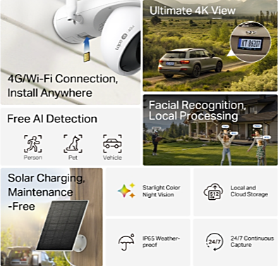 Kamera tukee kaksikaistaista Wi-Fi-yhteyttä (2,4 GHz ja 5 GHz) sekä 4G LTE -verkkoa. Kun Wi-Fi ei ole saatavilla, kamera siirtyy automaattisesti 4G-tilaan. SIM-kortin lisääminen tekee käyttöönotosta helppoa ja nopeaa.