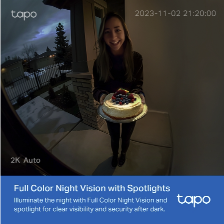 Tapo D210 tarjoaa erittäin tarkan kuvanlaadun, jonka ansiosta näet pienimmätkin yksityiskohdat. Laaja 160 asteen näkökenttä kattaa koko sisäänkäynnin päästä varpaisiin. Integroidut kohdevalot mahdollistavat täysvärisen yökuvauksen, ja mustavalkoinen yönäkö ulottuu jopa 7,6 metrin päähän - täydellinen ratkaisu myös pimeisiin olosuhteisiin.