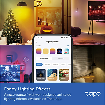 Tapo-sovelluksella voit synkronoida valot musiikin tahtiin ja käyttää valmiita valoefektejä tunnelman luomiseksi. Kaksikerroksinen rakenne takaa tasaisen ja miellyttävän valon ilman häikäisyä.