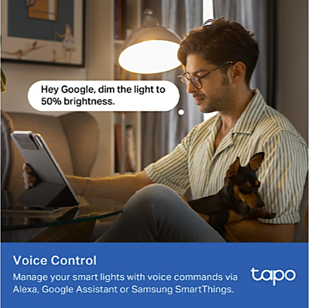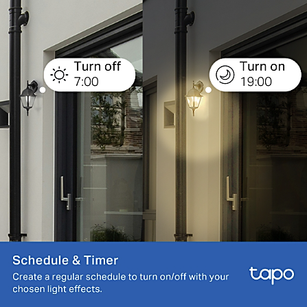 Ei tarvita erillistä hubia - yhdistä lamppu suoraan Wi-Fi-verkkoon ja hallitse sitä Tapo-sovelluksella. Ääniohjaus toimii Amazon Alexan, Google Assistantin ja Samsung SmartThingsin kanssa. Ajastukset, aikataulut ja auringonnousu-/laskuautomatiikka tekevät käytöstä helppoa. Lisäksi voit aktivoida Poissa kotoa -tilan, joka simuloi läsnäoloa.