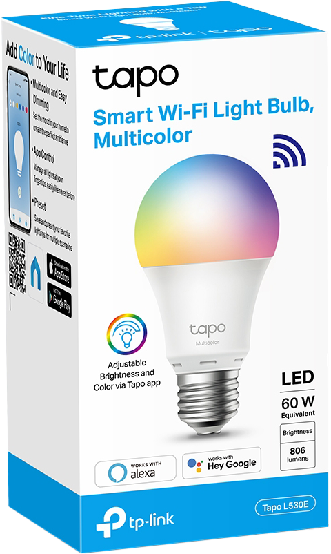 Tapo L530E on älykäs, monivärinen WiFi LED-lamppu, joka tarjoaa 16 miljoonaa kirkasta sävyä perinteisessä lampun muodossa. Tapo-sovelluksen avulla voit helposti asentaa ja käyttää lamppua, tallentaa erilaisia asetuksia ja ajastaa valot. Lampun käyttöikä on vaikuttavat 15 000 tuntia. Tämä 60 watin vastaava LED-lamppu tuottaa jopa 806 lumenin valkoisen kirkkauden ja siinä on himmennysalue 1 %:sta 100 %:iin.