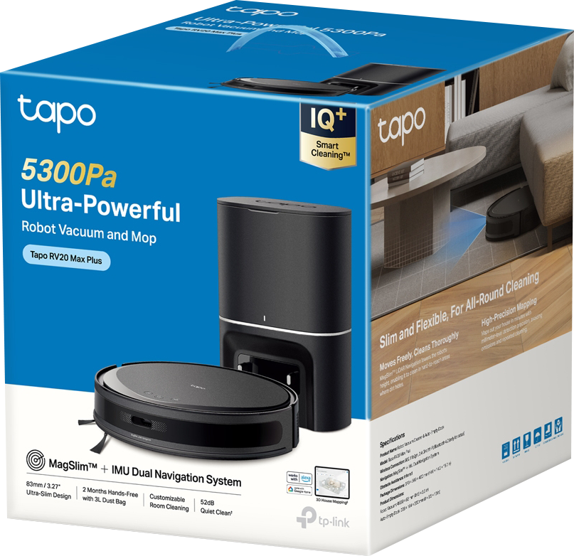 Tapo RV20 Max Plus tarjoaa 5300Pa:n ultra-tehokkaan imutehon, joka poistaa pölyn, lemmikkien karvat ja murut vaivattomasti kaikilta lattiatyypeiltä. Sen 83 mm:n ohut muotoilu liukuu helposti sohvien ja sänkyjen alle, puhdistaen myös vaikeasti saavutettavat piilopaikat.