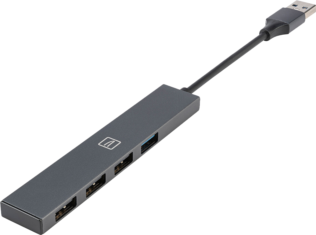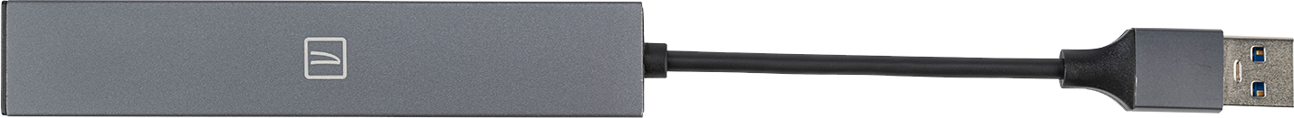 4-in-1 alumiininen ultraohut hubi, jossa on 6 cm pitkä USB-A-kaapeli, 3 x USB 2.0 -porttia ja 1 x USB 3.0 -portti.