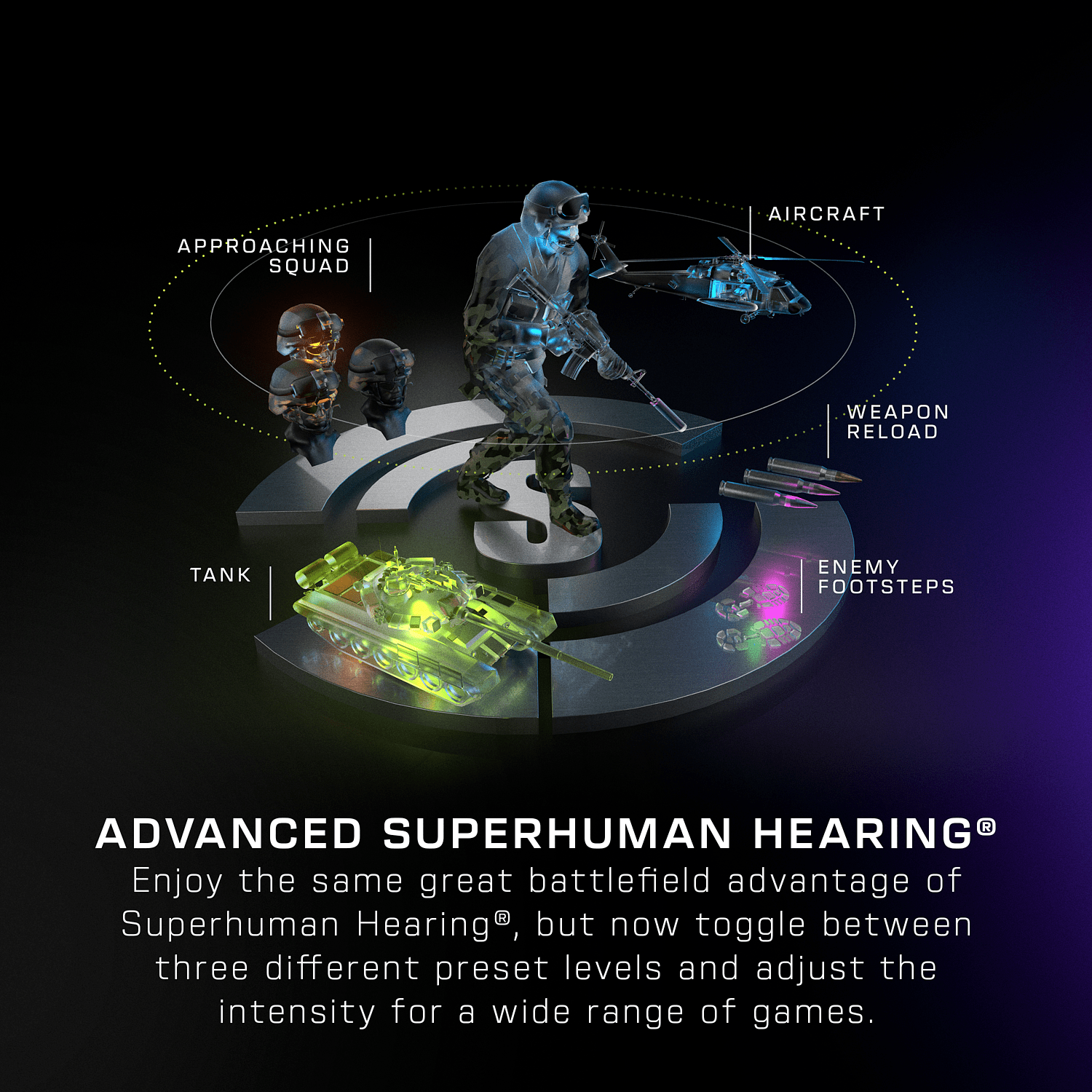 60 millimetrin Eclipse-elementtien ansiosta äänentoisto on kirkasta ja selkeää. Kuulokkeiden vaikuttava tilaäänitekniikka herättää pelien tapahtumat eloon ainutlaatuisella tavalla, mikä vie pelitunnelman uudelle tasolle. Turtle Beachin oman Superhuman Hearing -ominaisuuden ansiosta myös hiljaiset äänet erottuvat tarkasti.
