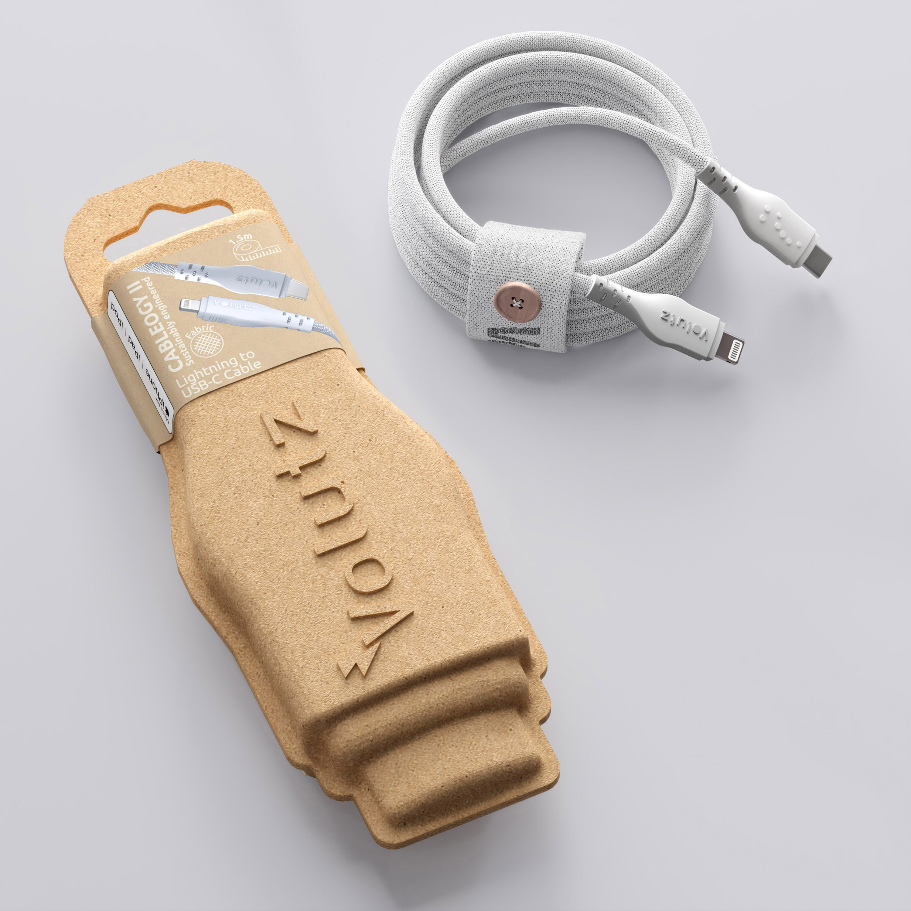 Cableogy II -sarjassa on kaksi pituutta 1,5 m ja 3 m, ja siinä on tyylikäs kaapelijärjestelmä kankaasta, jossa on puinen nappi, tämä auttaa sinua säätämään täydellisen kaapelin pituuden tai helpottamaan säilytystä.