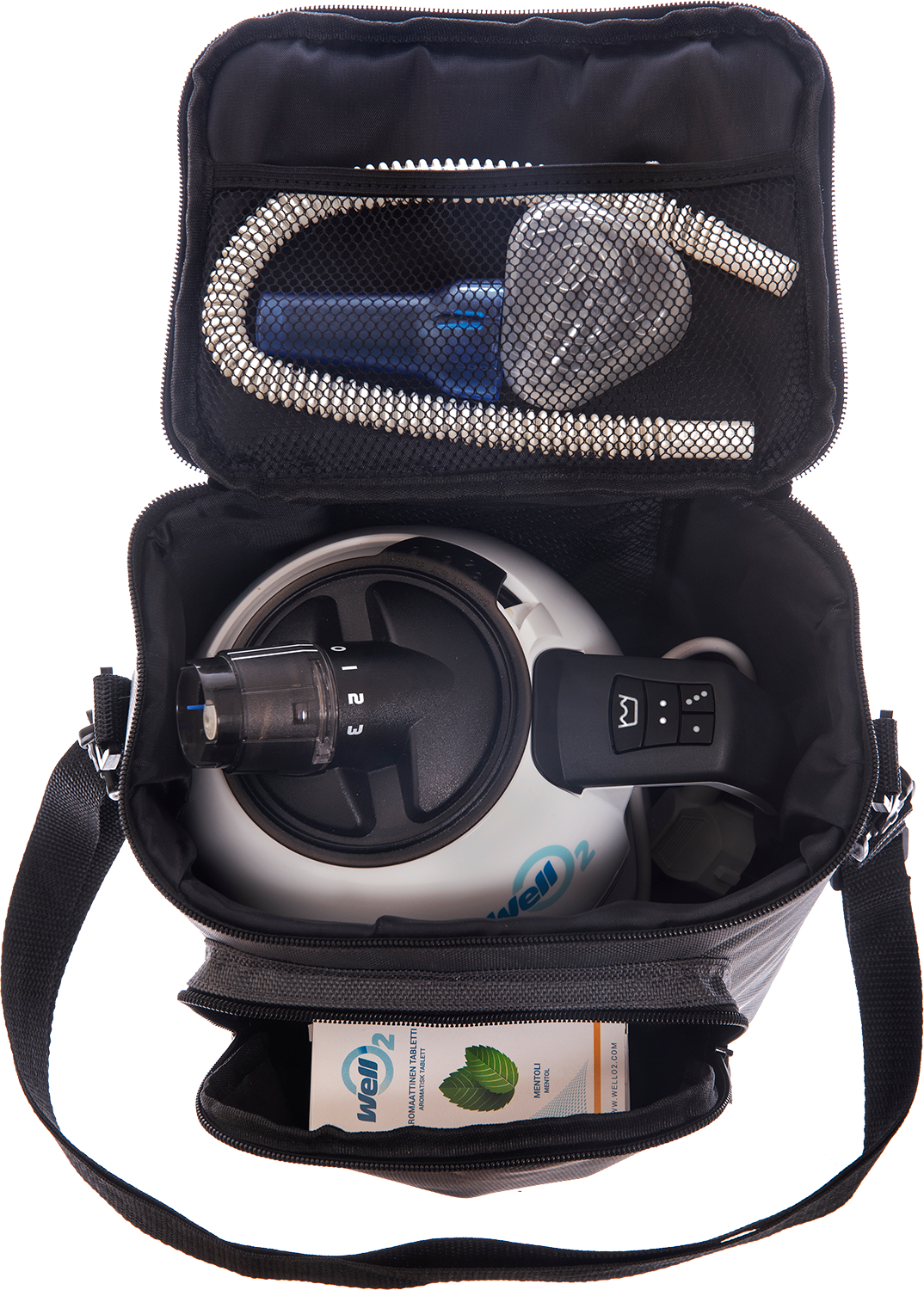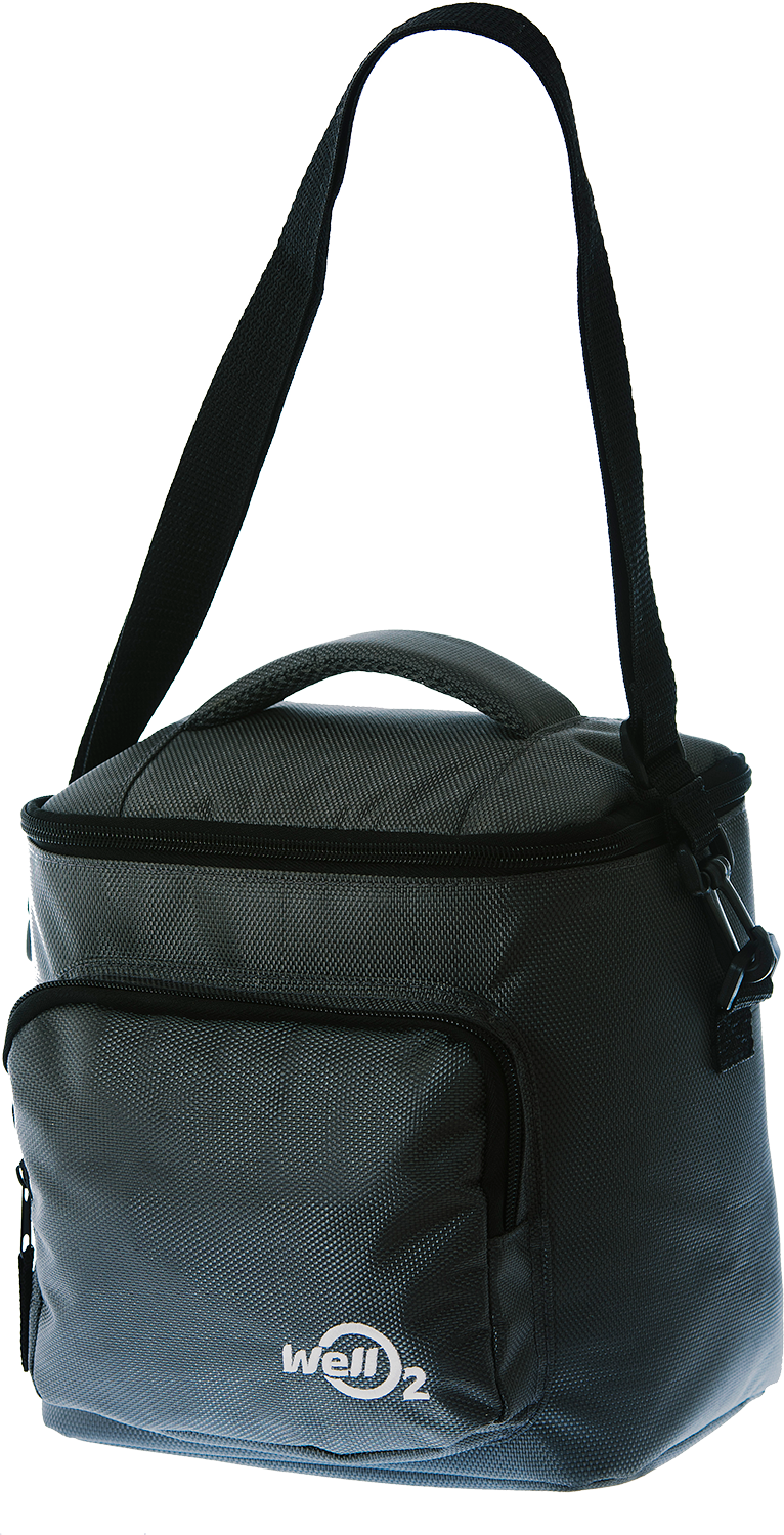 WellO2 kuljetuslaukku soveltuu WellO2-laitteen ja sen osien turvalliseen säilytykseen sekä kuljetukseen. Sisältä pehmeässä laukussa on kantokahva sekä irrotettava olkahihna. Laukun edessä olevassa tasku soveltuu hyvin laitteen irto-osien säilytykseen. Sisällä olevassa verkkotaskussa voidaan säilyttää esimerkiksi laitteen suukappaletta, jolloin se pääsee kunnolla kuivumaan.